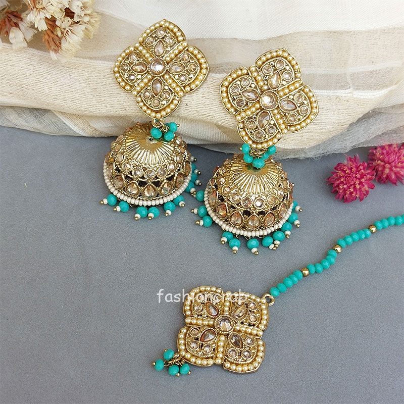 A pair of Traditional Aamna Maang Tikka with Earrings – Sea Green for Bride with repeated polki stone.