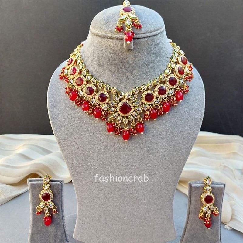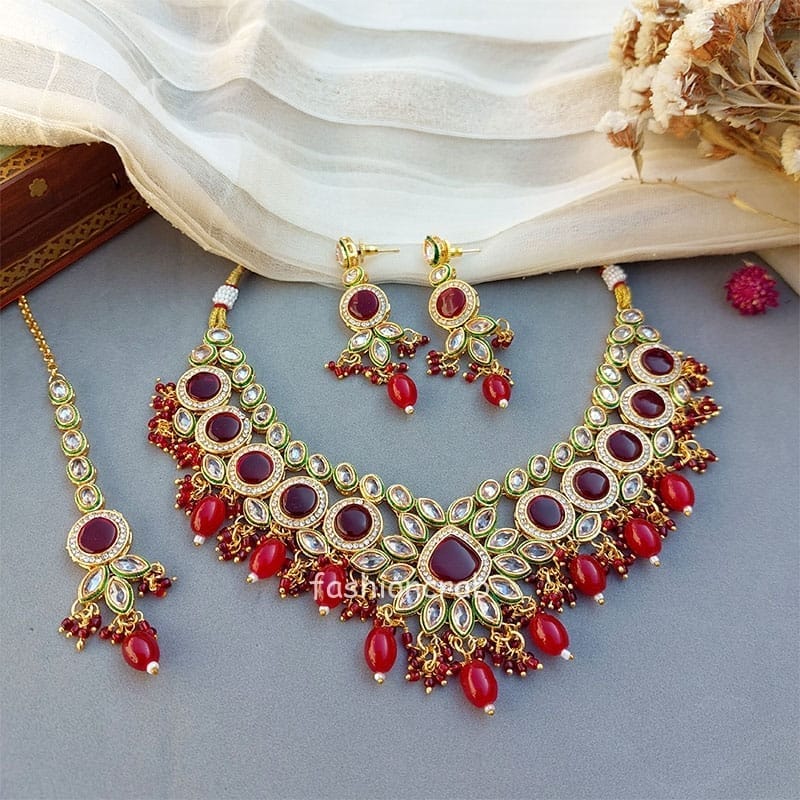 A pair of Traditional Maroon Polki Jewellery Set for Wedding.