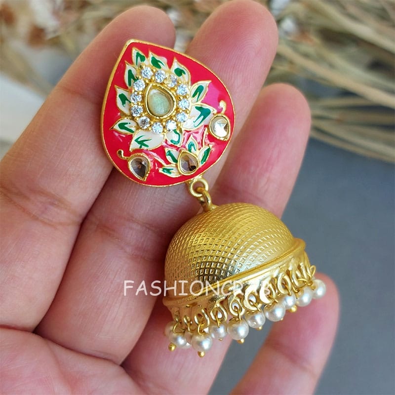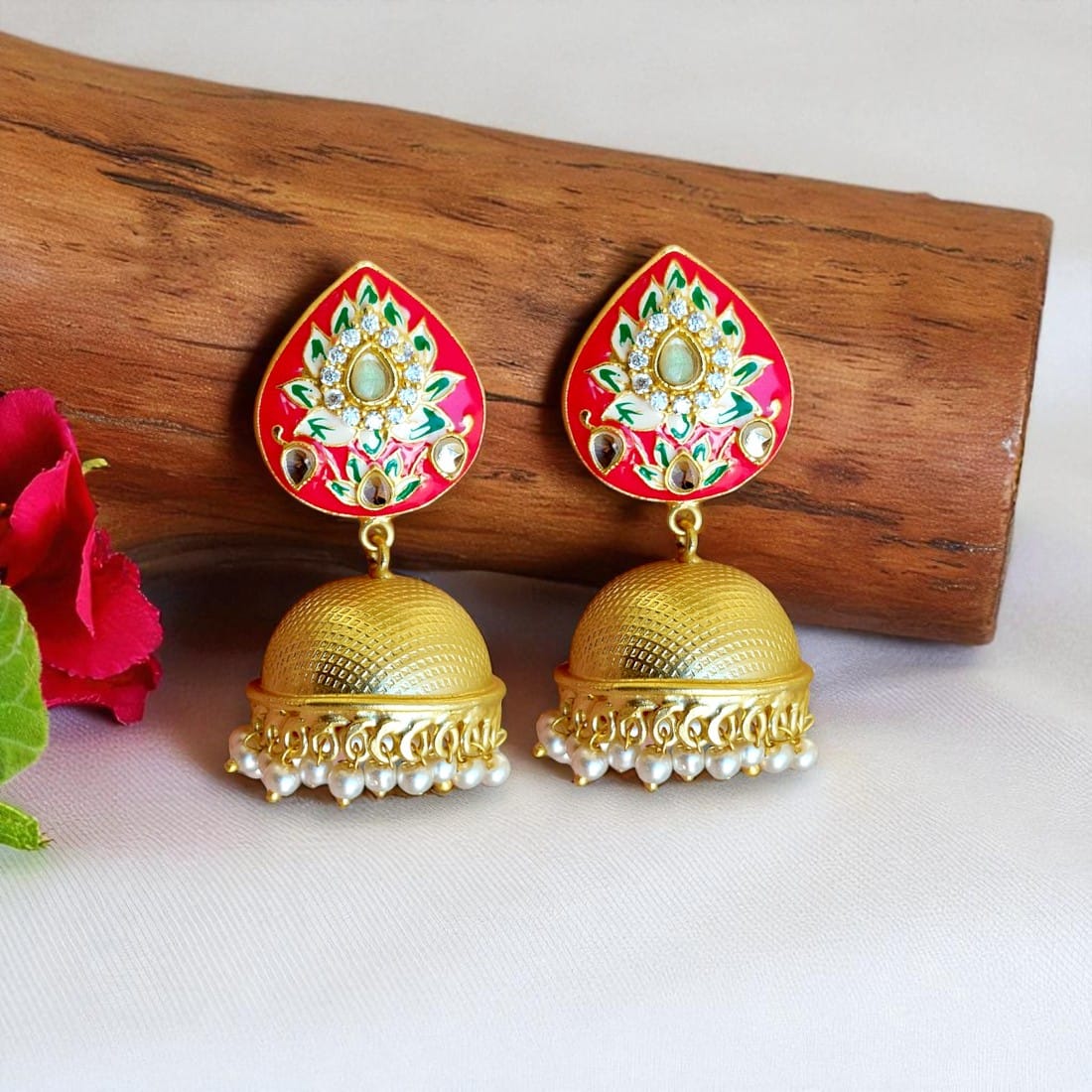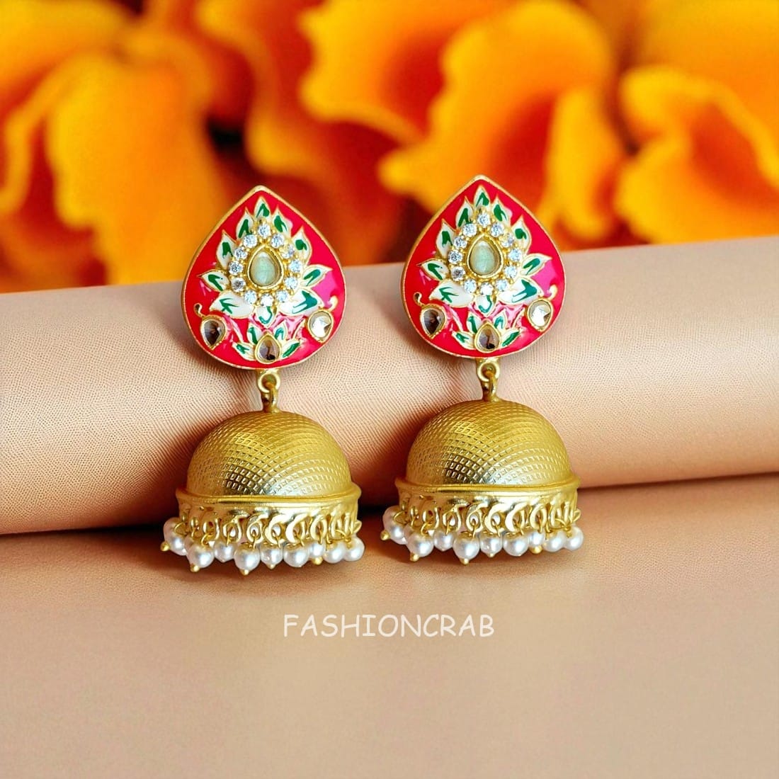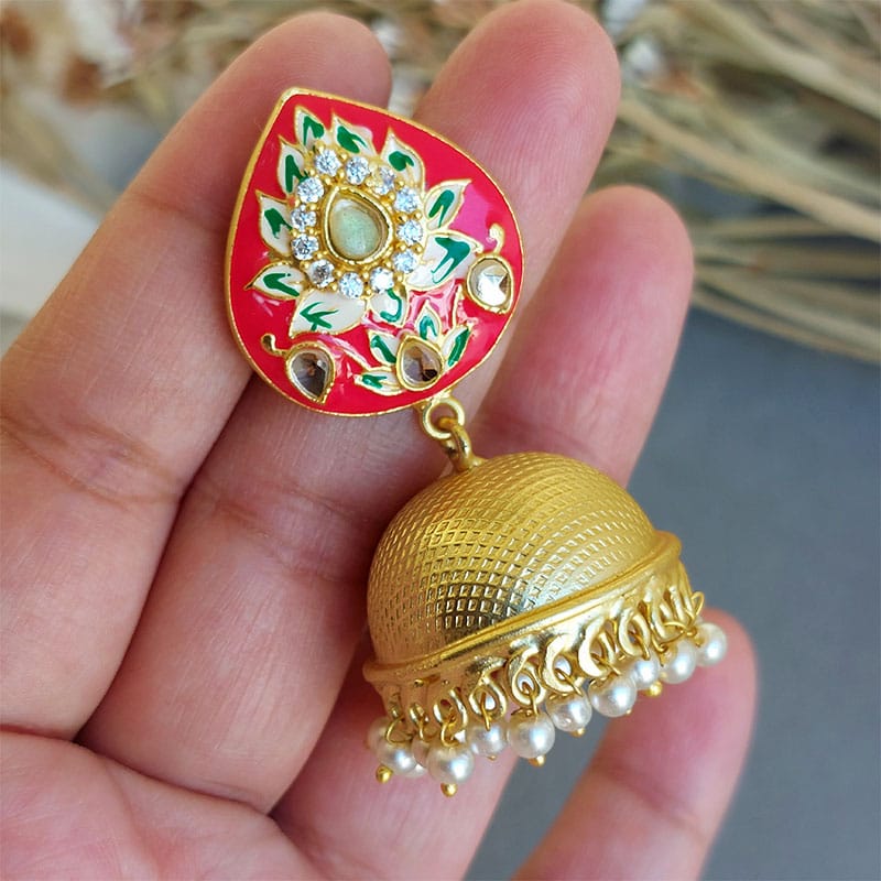 A pair of golden-toned Alia Meenakari Jhumka – Pink Earrings for Girls with hanging pearls.