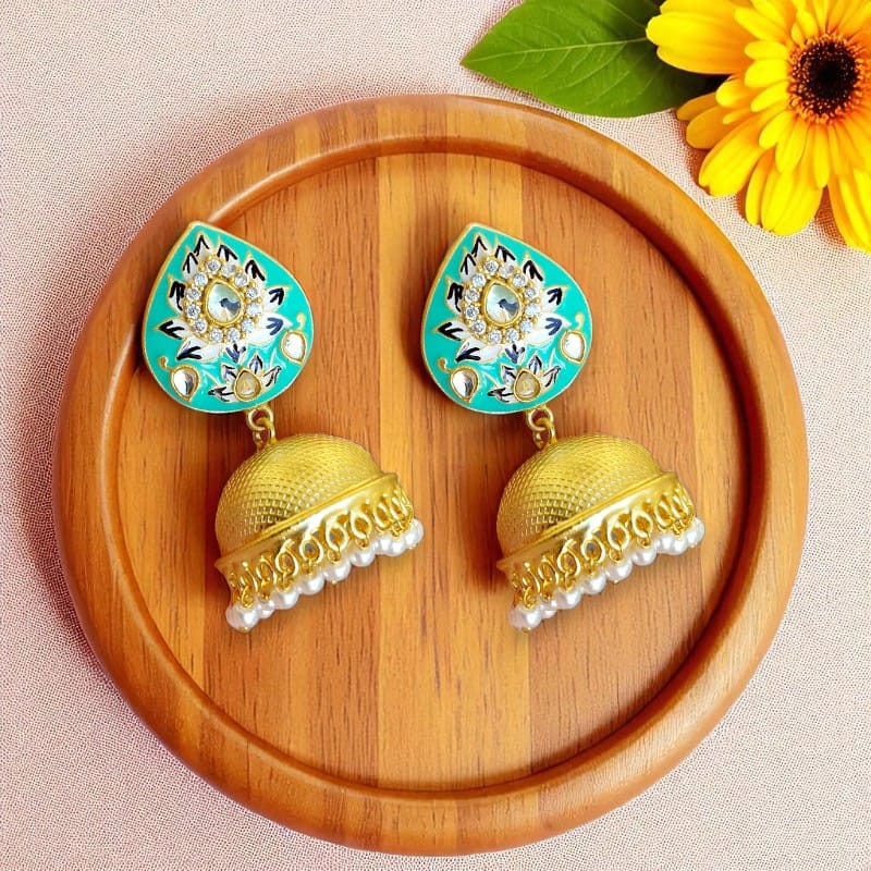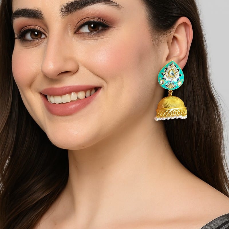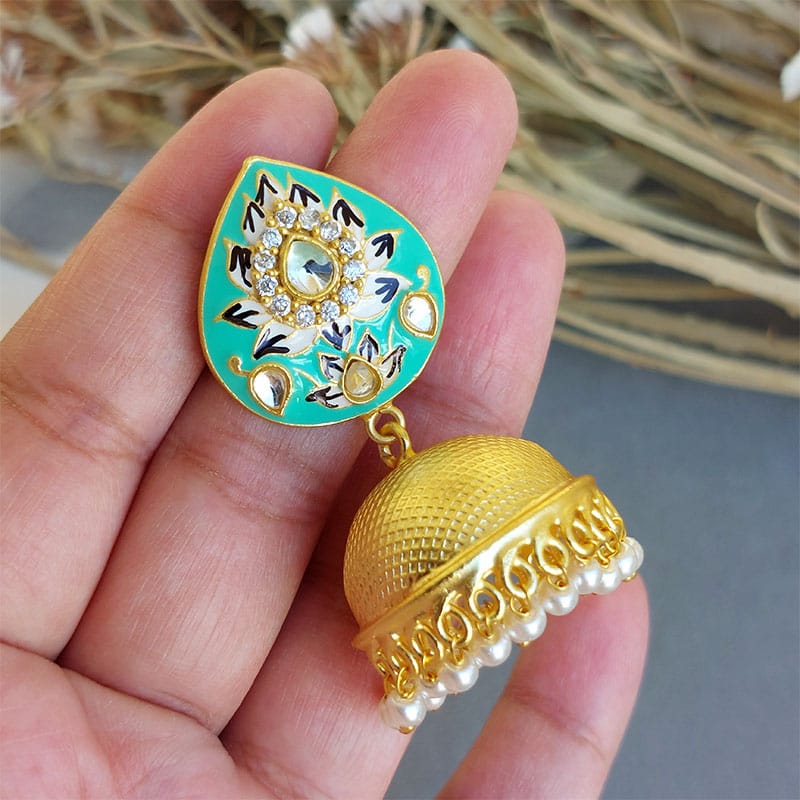 A pair of golden-toned Alia Meenakari Jhumka – Mint Green Earrings for Girls with hanging pearls.