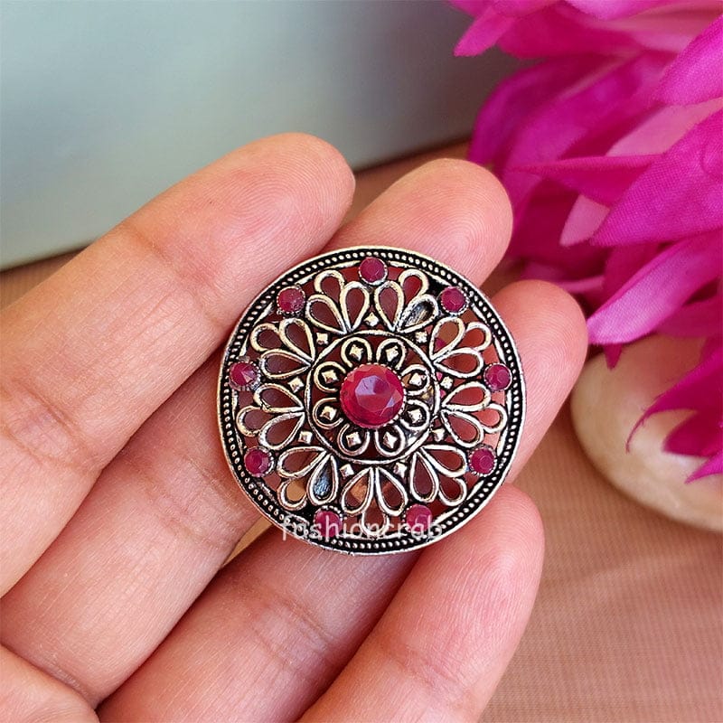 Wear it with an Anarkali kurta, Salwar Suit, Saree, and heels to match your elegant persona. This silver-toned adjustable partywear oxidized ring has an intricate design with a stone-studded detail in the center which adds to the charm of this ring.