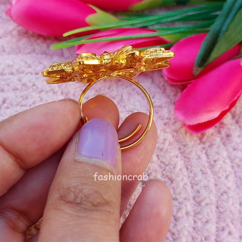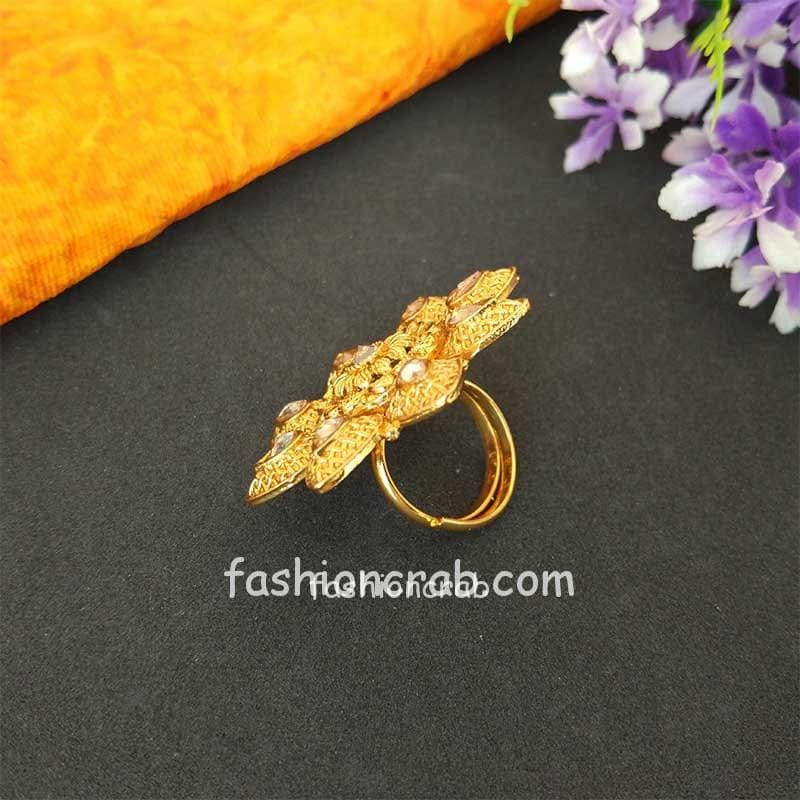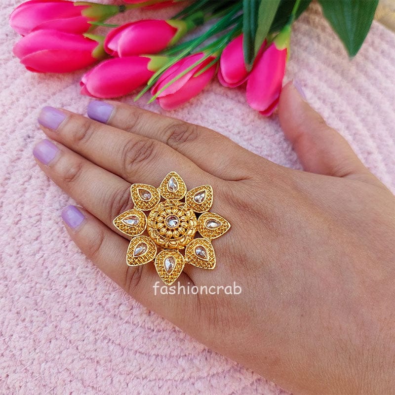 Accessorise your ethnic look by wearing this Adjustable Polki Finger Ring for Bride from Fashioncrab to give a classy touch to your attire. Alloy has been used in the making of this yellow golden polki beauty, which will sit pretty on your fingers and sparkle away. Wear it with an Anarkali kurta, Salwar Suit, Saree and heels to match your elegant persona. This gold-toned adjustable wedding polki ring has a detailed design with a stone-studded all over which adds to the charm of this gorgeous ring. It can be worn for Engagement and Wedding Parties and can be used as a cocktail ring. One of the best gift for your loved ones. Keep away from Perfumes, Spray and Water. Nickel free and Lead-free as per International Standards that make it very skin friendly.