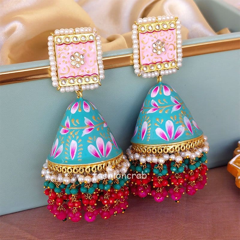 A pair of Gold Plated Big Mint Green Meenakari Pearl Jhumka Earring for a Wedding.