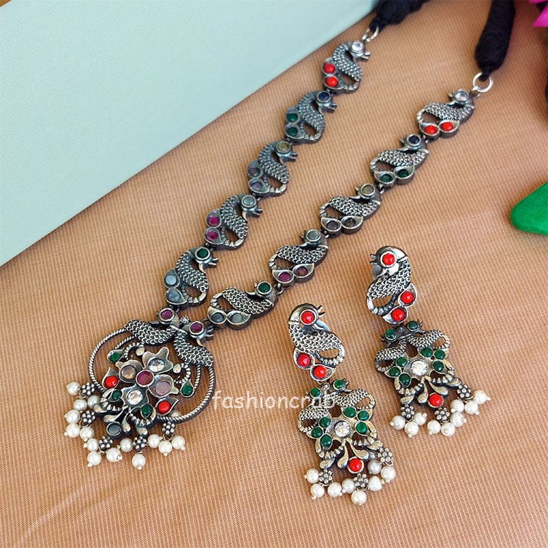 A pair of Black Tone Oxidised Necklace with Earring for saree.