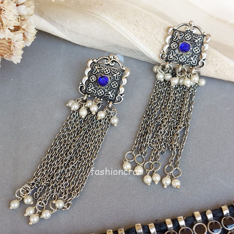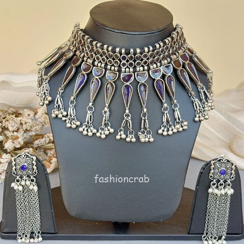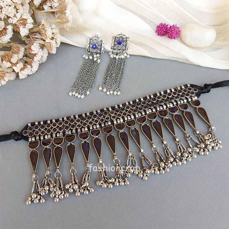 A pair of Blue Oxidised Choker Set with Earrings for Saree.