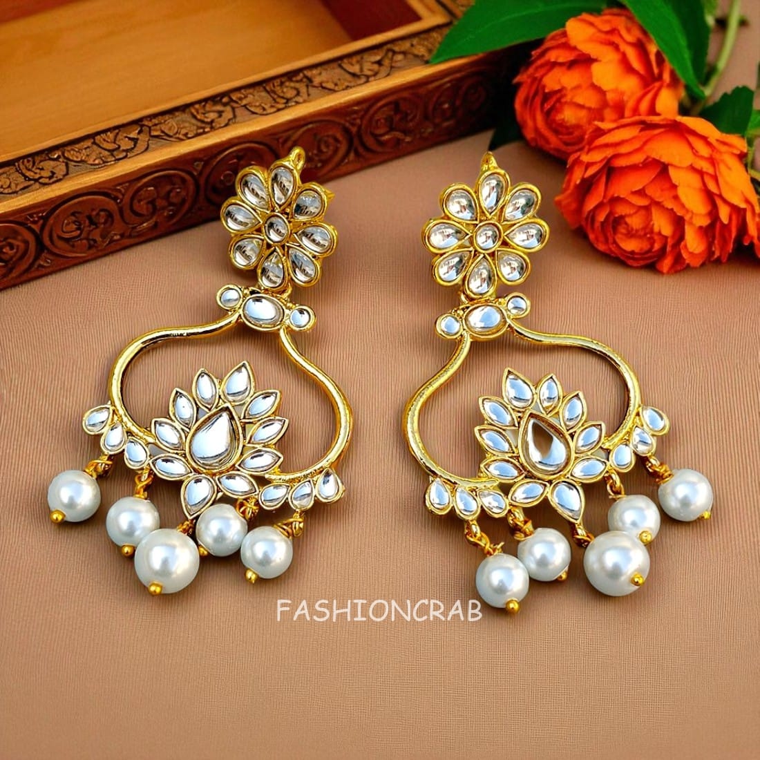 A pair of golden-toned Designer Kundan Earrings.