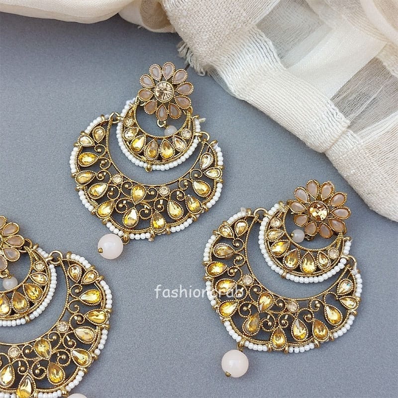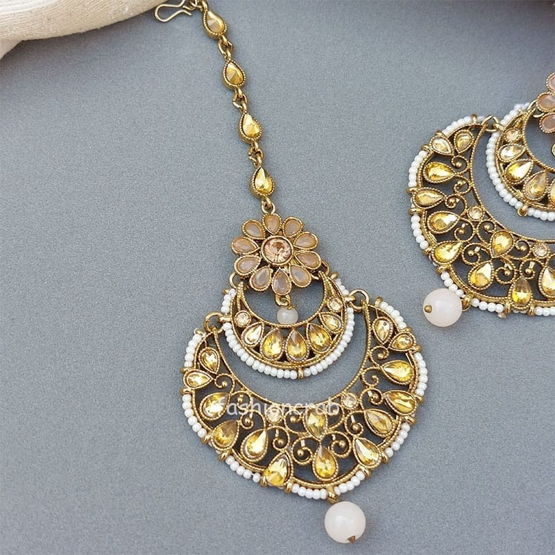 A pair of Gold Toned Earrings with Tikka Set for Wedding Function.
