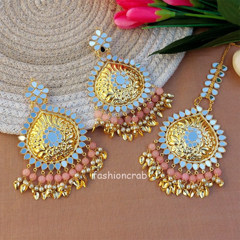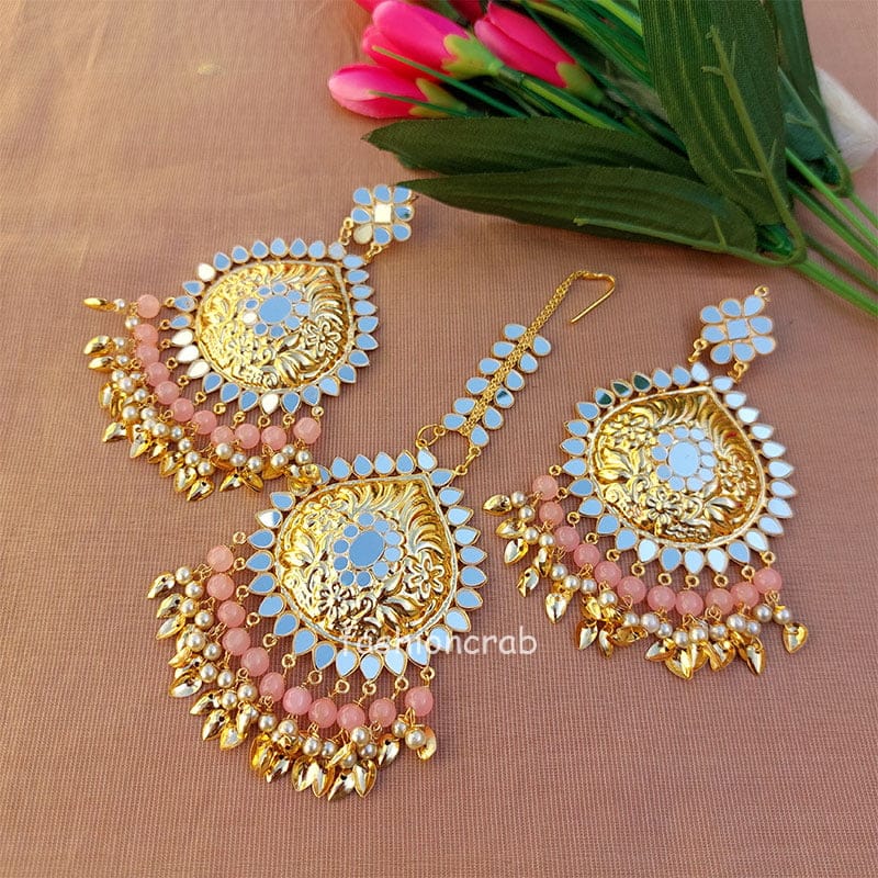 A pair of Ethnic Pipal Patti Matha tikka with Earring Set – Light Pink for Wedding with mirror work.