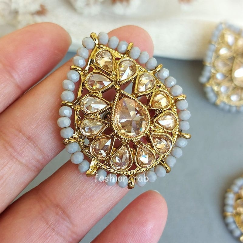 A pair of Gold Tone Indian Bollywood Style Grey Pearl Maang Tikka with Earring for Dulhan with unique floral design.