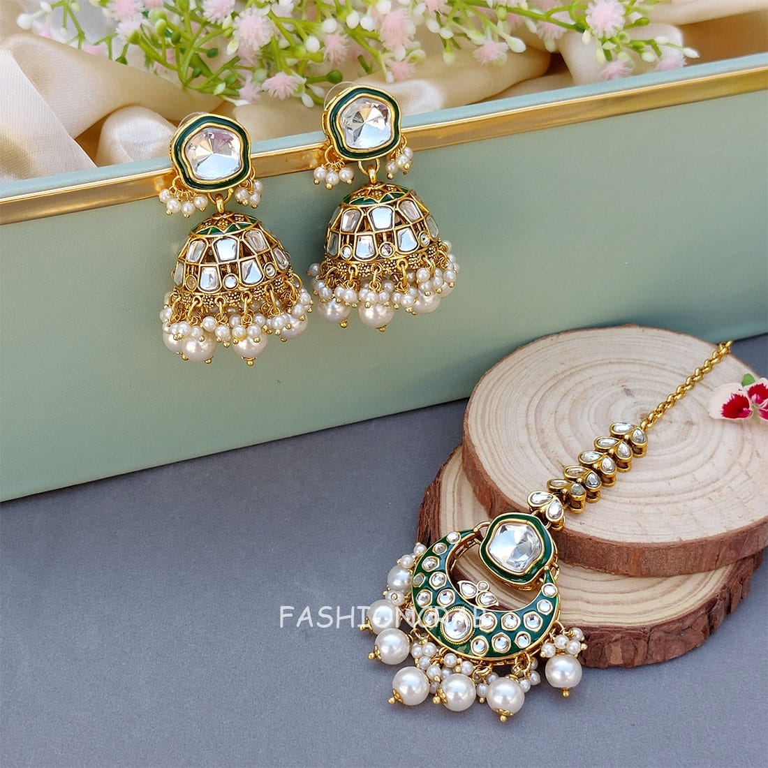 Indian Bollywood Style Ishira Kundan Earrings and Maangtikka - Green