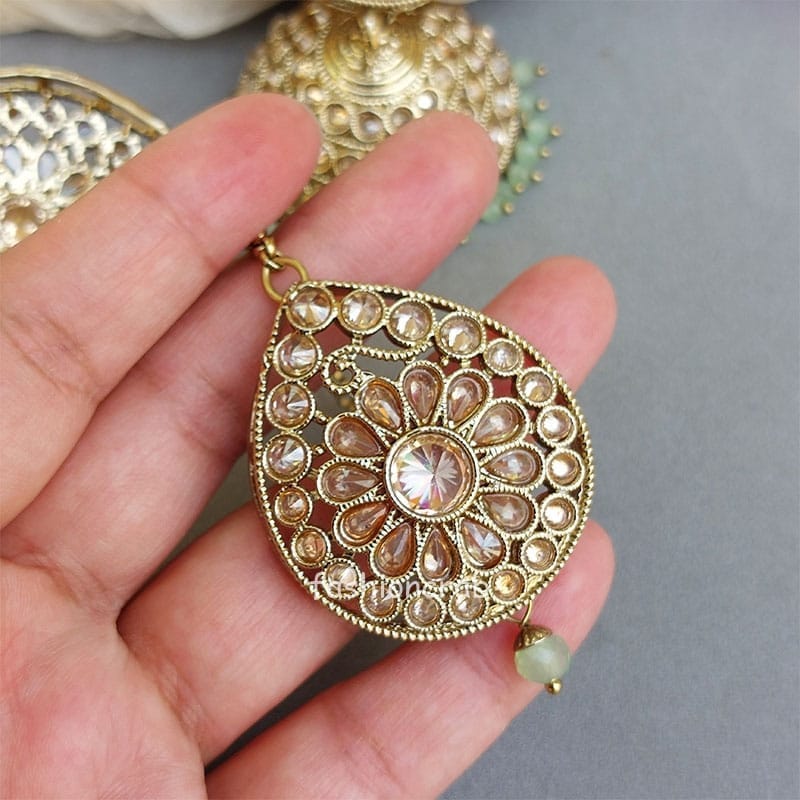 A pair of Traditional Pista Green Earring and Tikka Set for Saree.