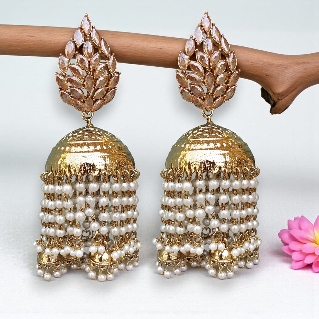 A pair of golden-toned Bollywood Chandni Big Jhumka Earring.