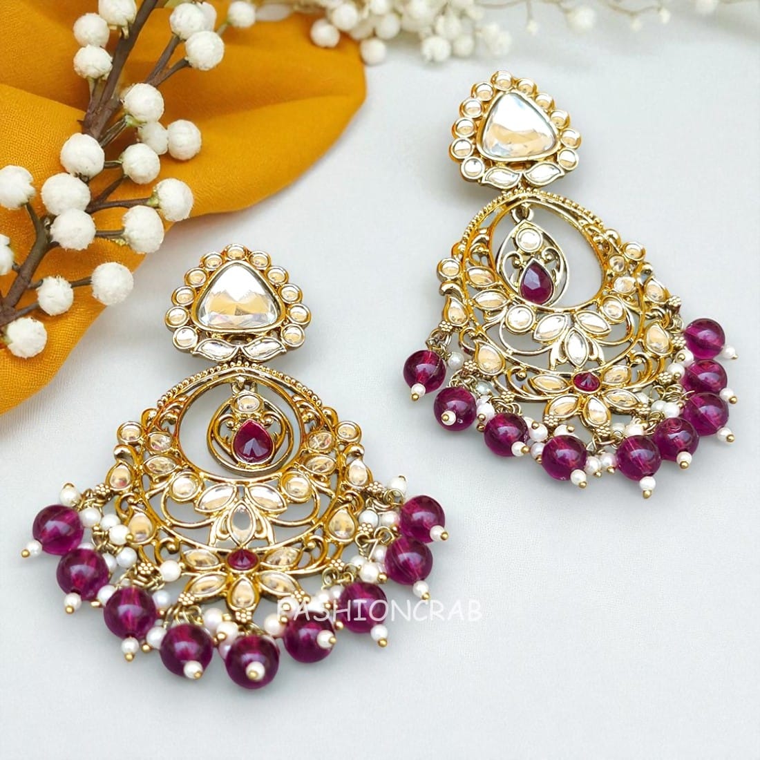 A pair of golden-toned Bollywood Falak Earrings for Wine Saree.
