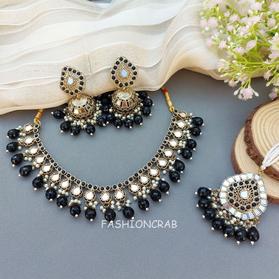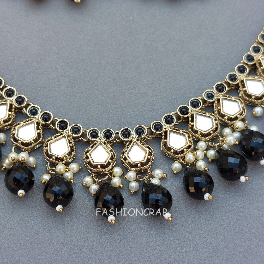 A pair of Gauri Mirror Necklace – Black Set for Lehenga.