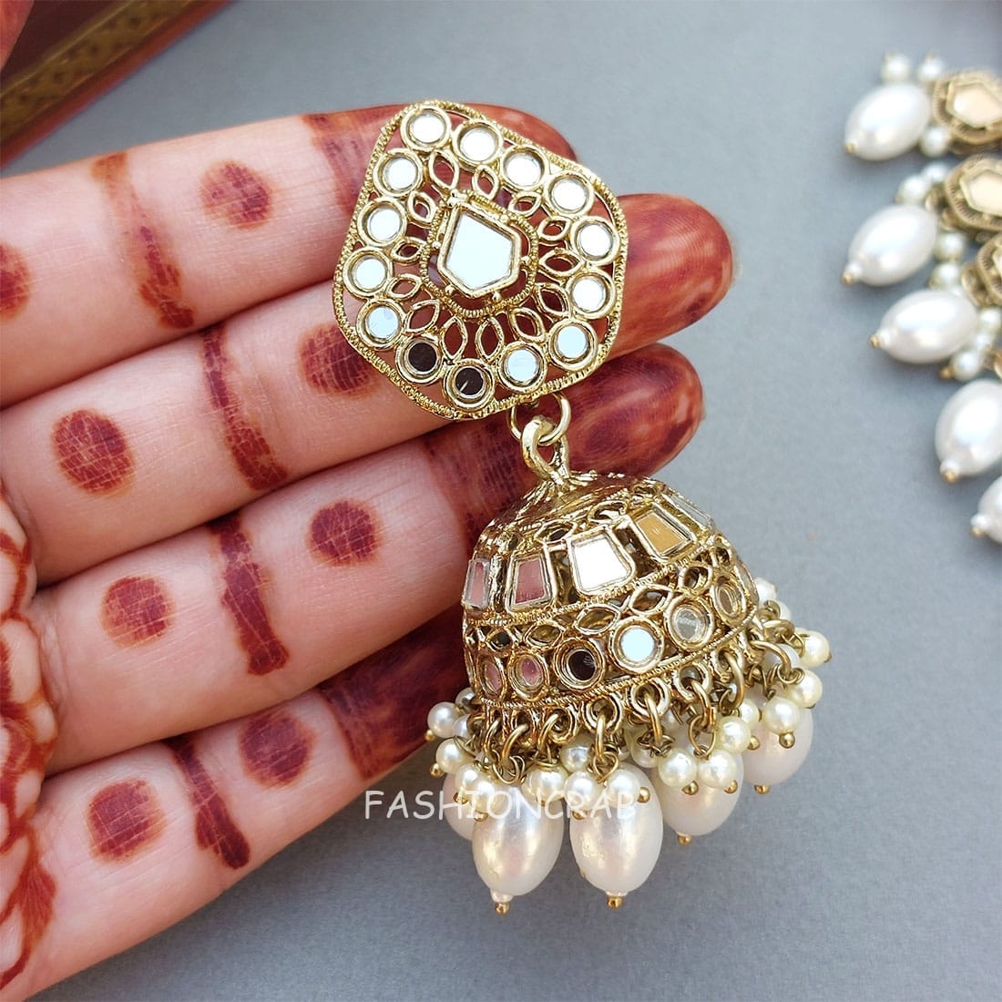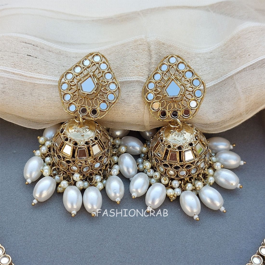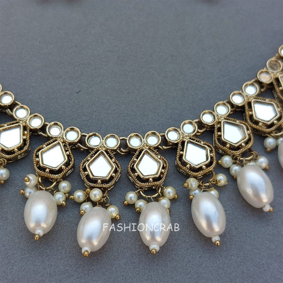 A pair of Gauri Mirror Necklace – White Set for Lehenga.
