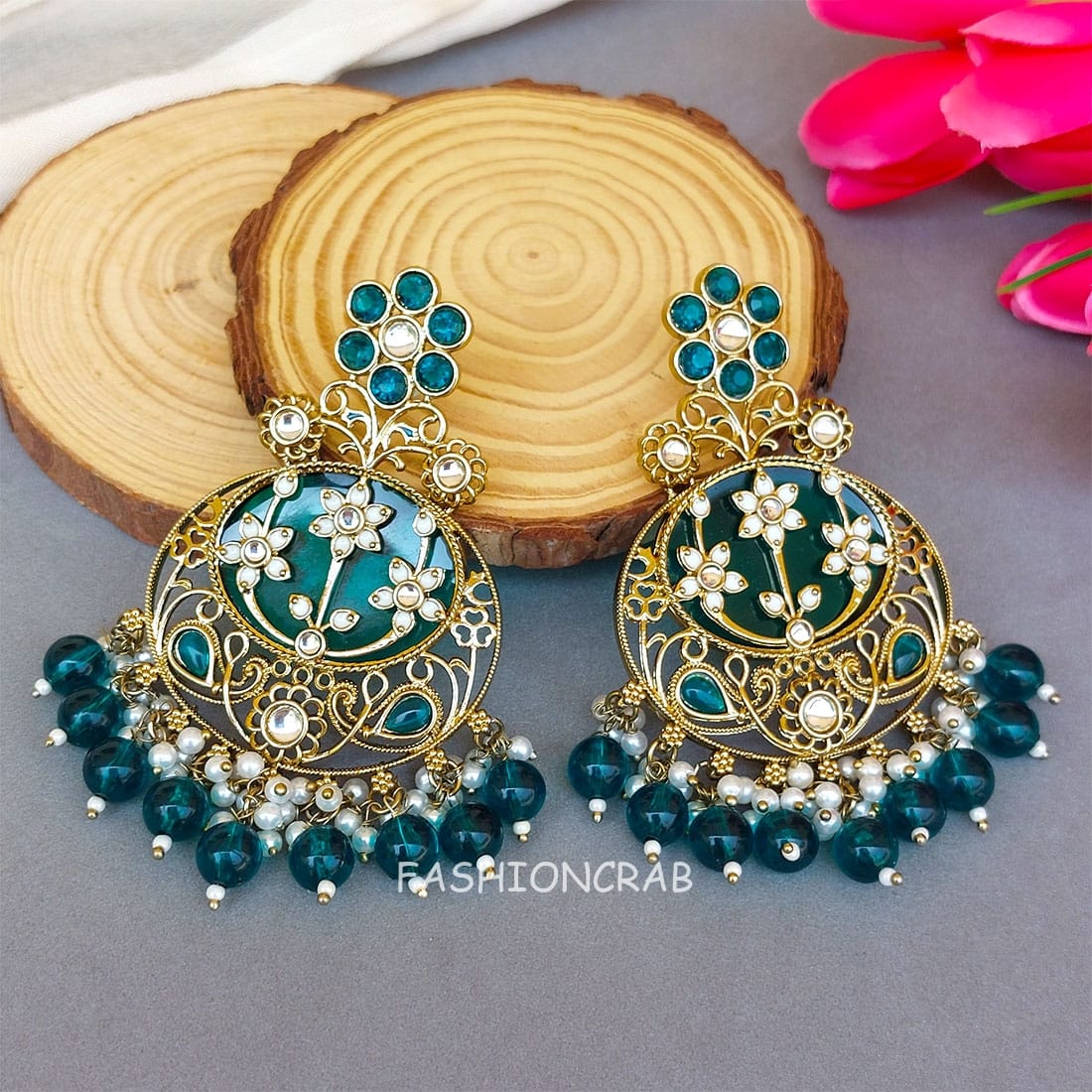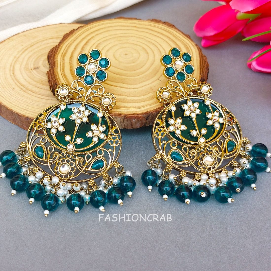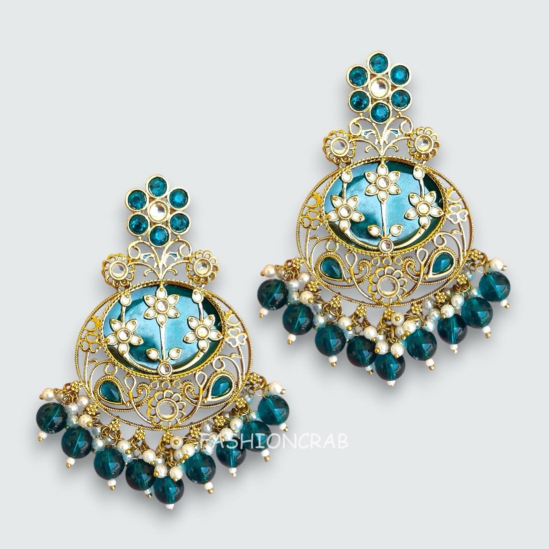 A pair of golden-toned Bollywood Geet Kundan Chandbali Earrings Peacock Blue.