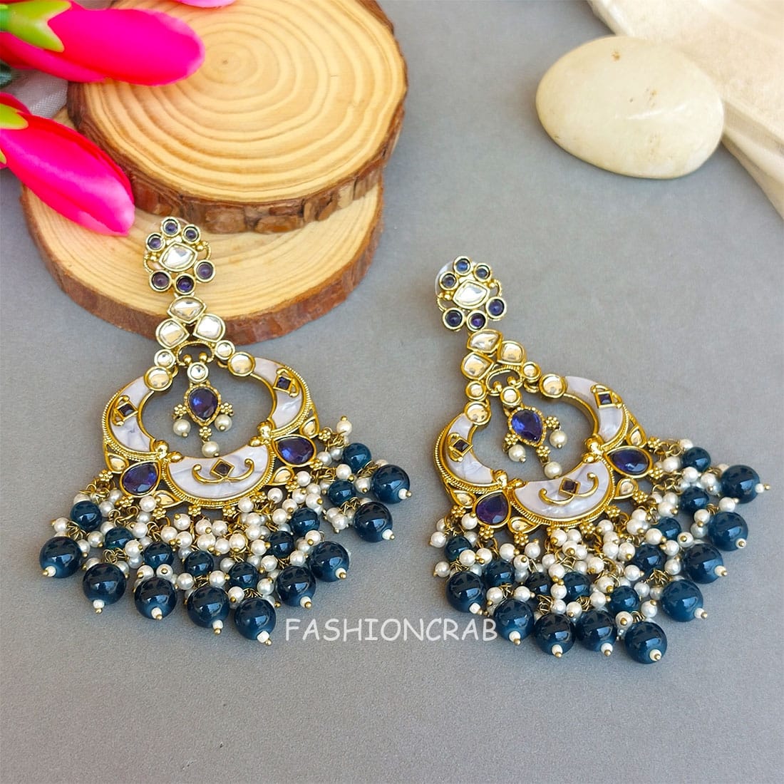 A pair of golden-toned Bollywood Gunjan Kundan Earrings Blue.