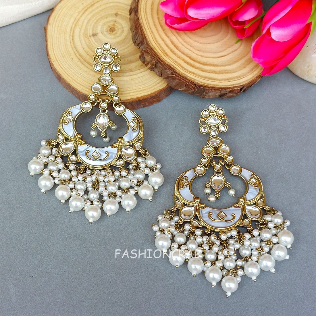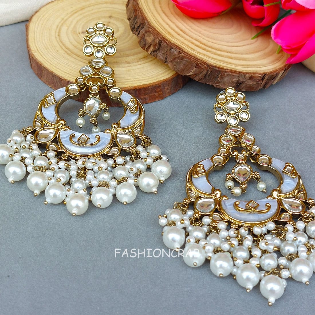 A pair of golden-toned Bollywood Gunjan Kundan Earrings White.
