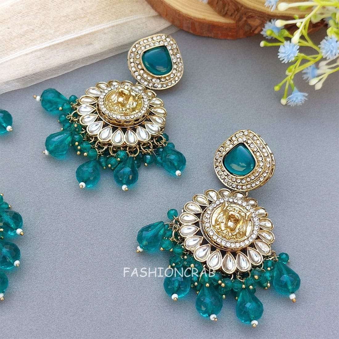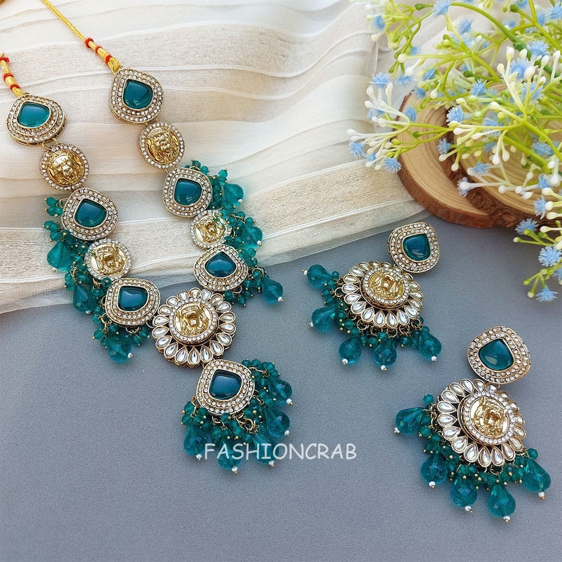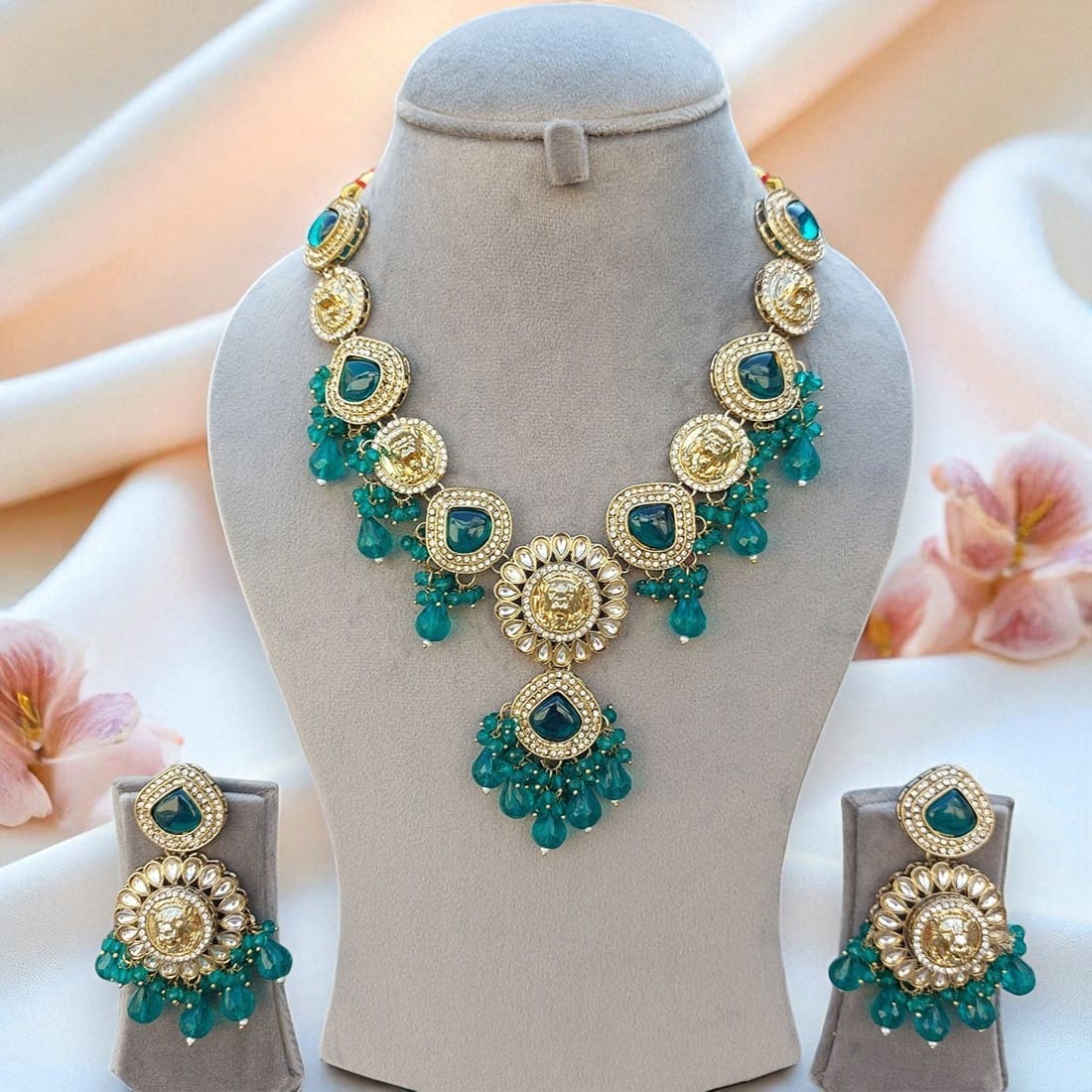A pair of Traditional Inayat Kundan Necklace – Peacock Blue.