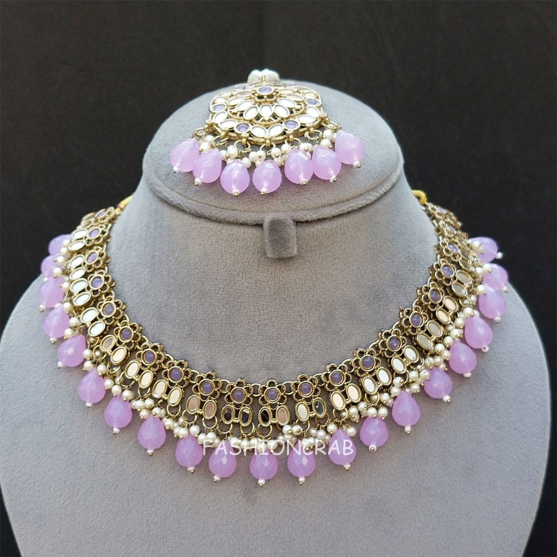 A pair of Katyayani Mirror Jewellery Set – Lavender Set for Lehenga.