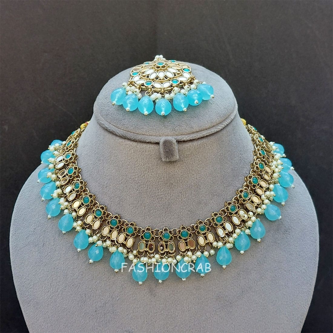 A pair of Katyayani Mirror Jewellery Set – Light Blue Set for Lehenga.