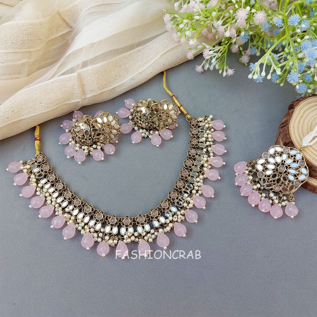 A pair of Katyayani Mirror Jewellery Set – Light Pink Set for Lehenga.