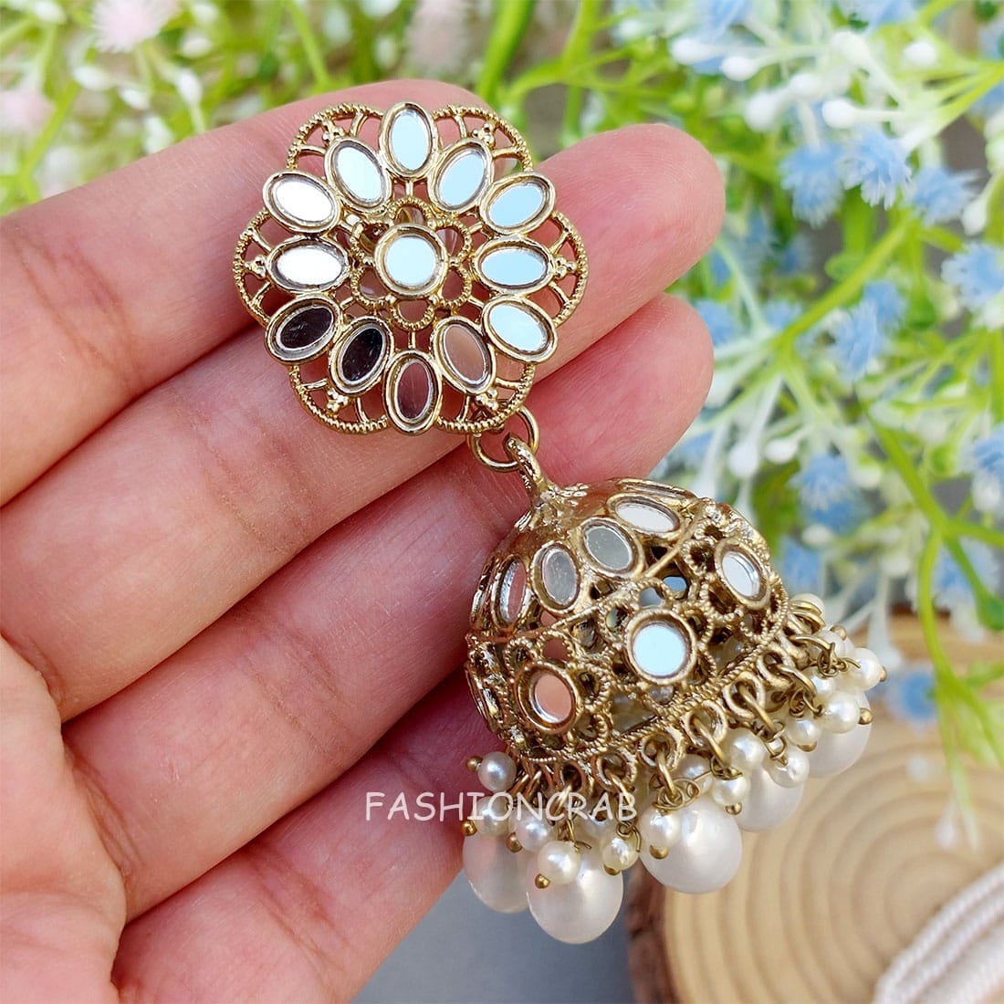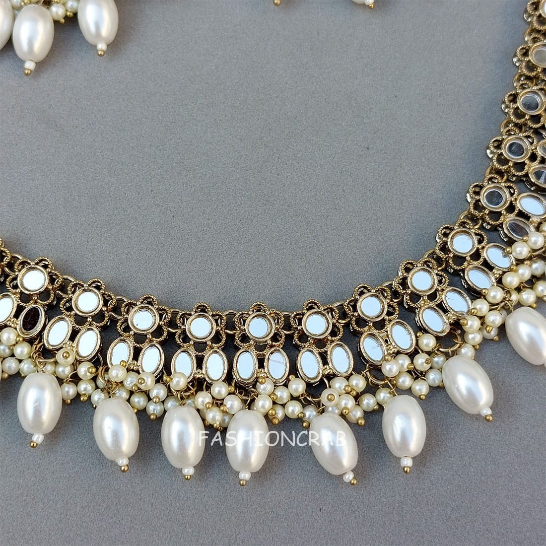 A pair of Katyayani Mirror Jewellery Set – White Set for Lehenga.