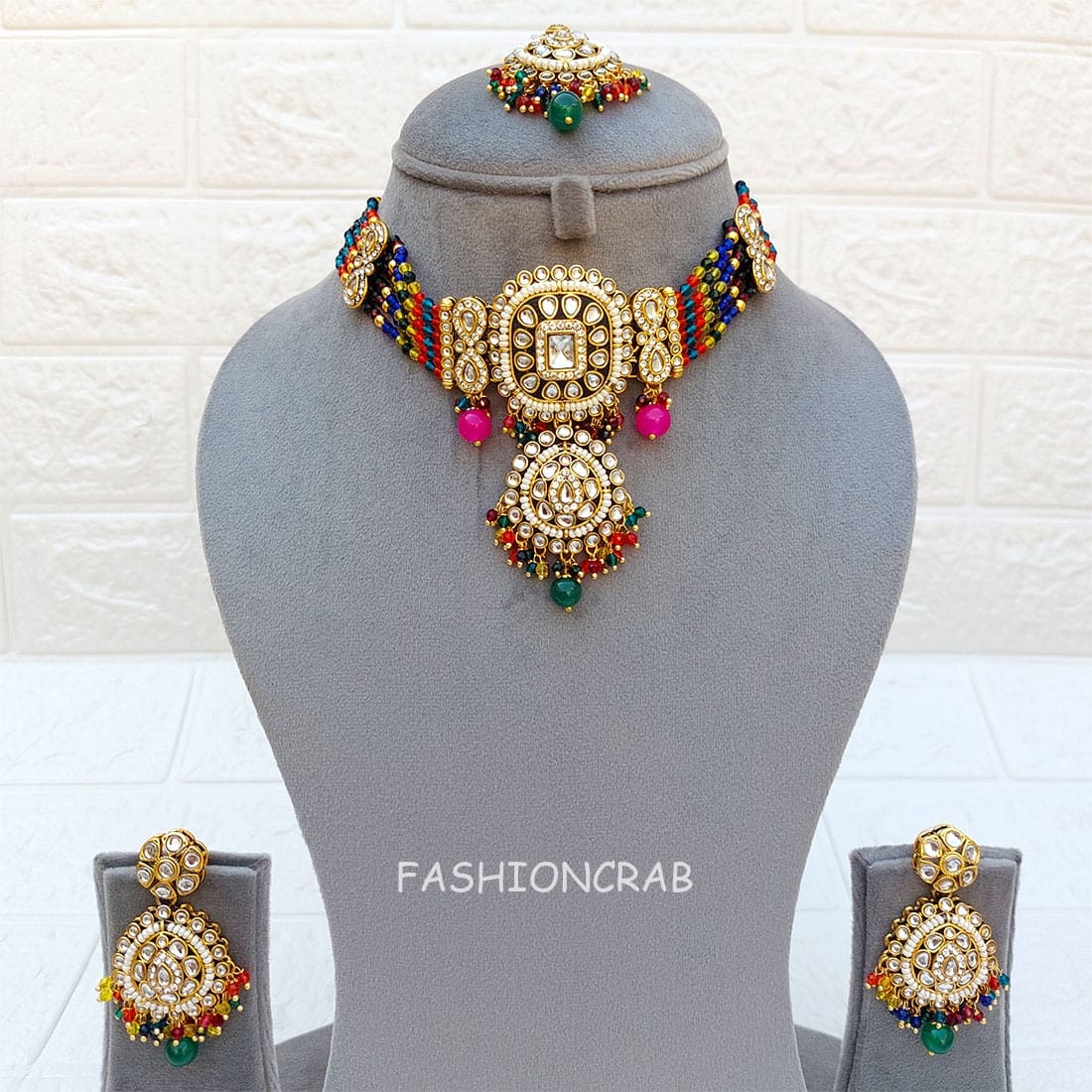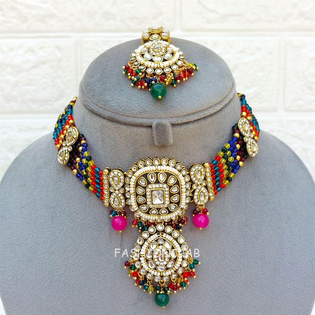 A pair of Traditional Multicolor Kundan Necklace for Wedding.