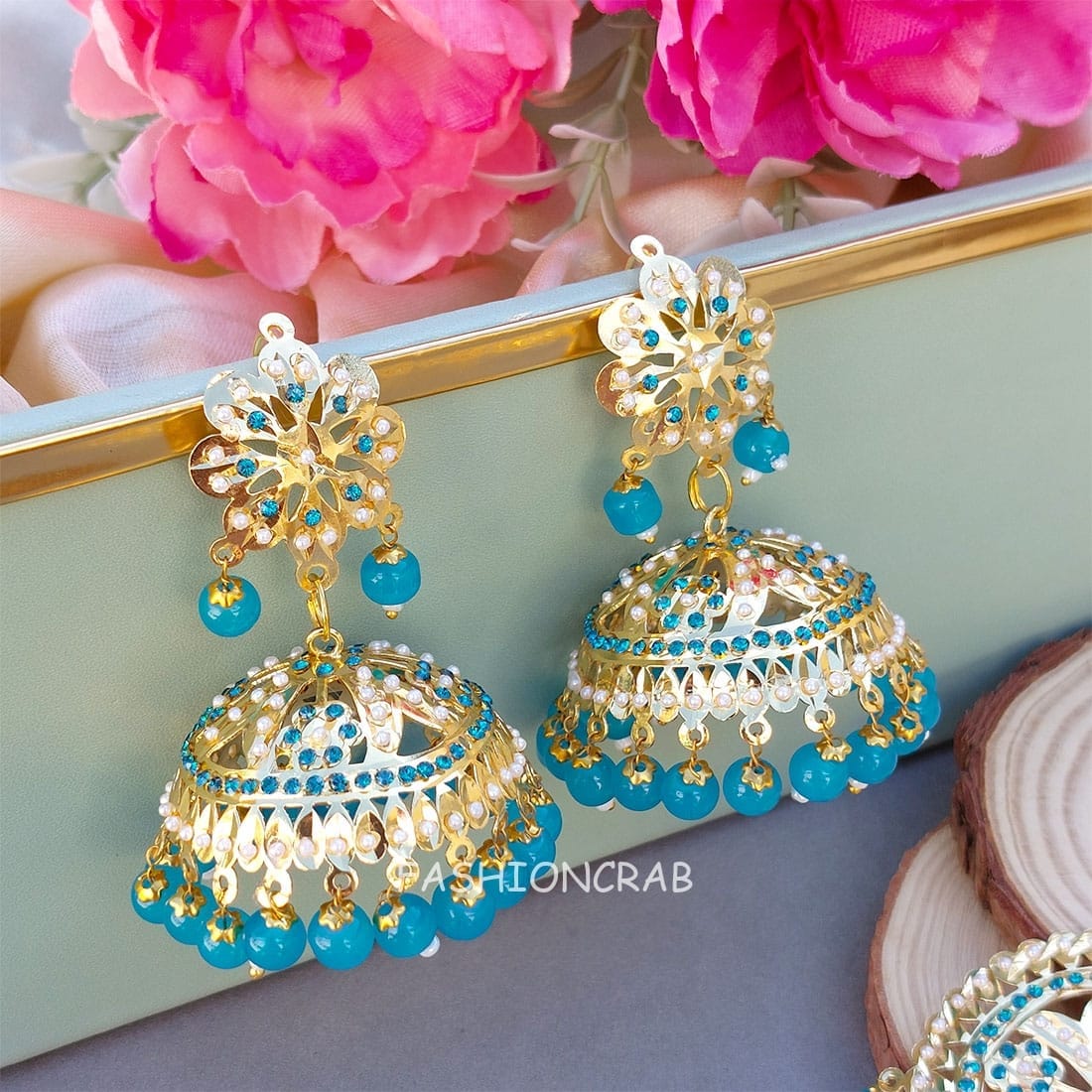 A pair of Noor Jadau Earrings Blue for a Sharara Suit.