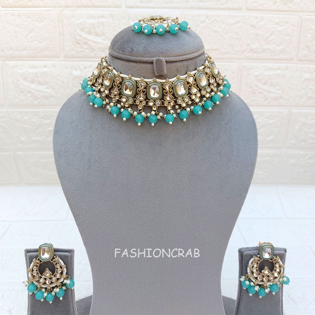 A pair of Traditional Pari Kundan Choker Set Blue for Bride.