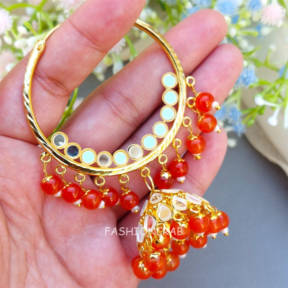 A pair of Tulip Mirror Earrings Orange Jhumka Bali with Tikka for Patiala Suit.