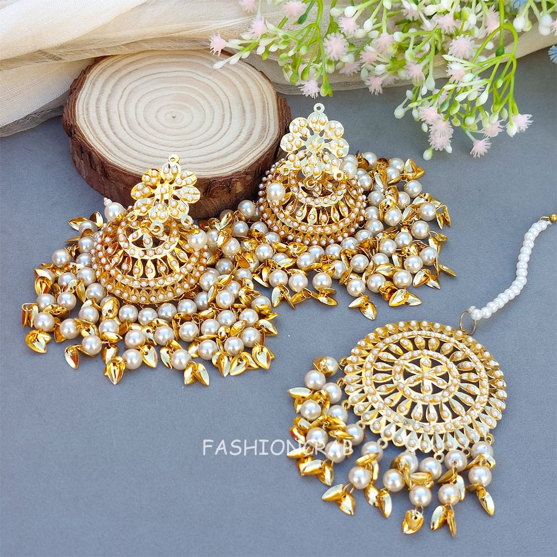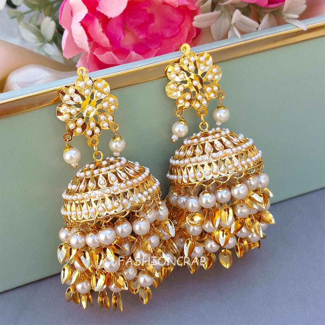 A pair of Traditional White Heavy Jadau Jhumka Earrings for Punjabi Suit.