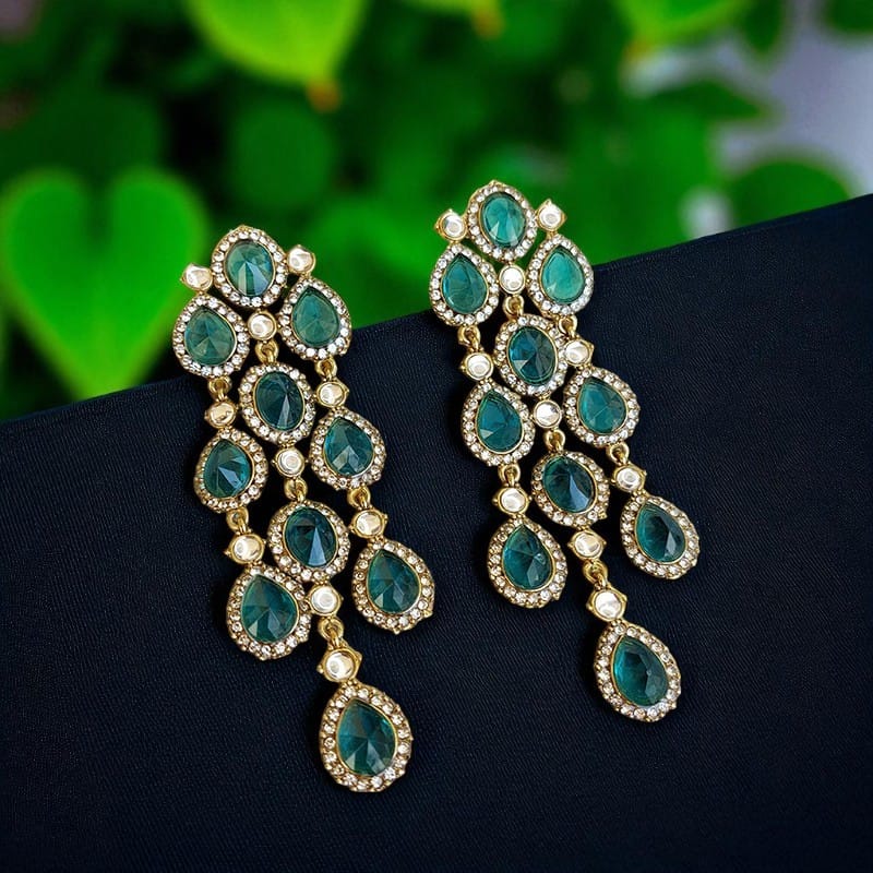 A pair of Jennifer Western Earrings – Peacock Blue with embedded stones all over.