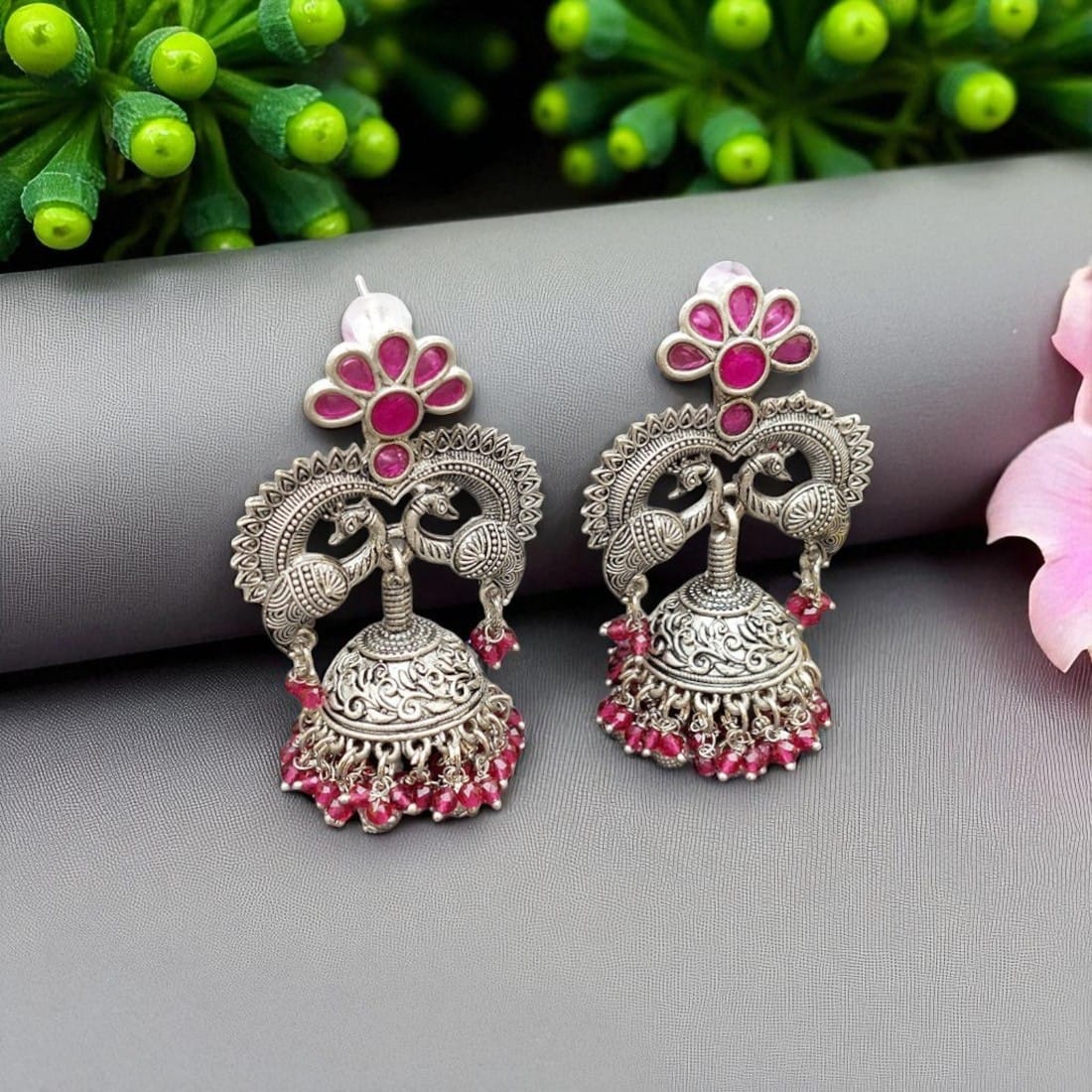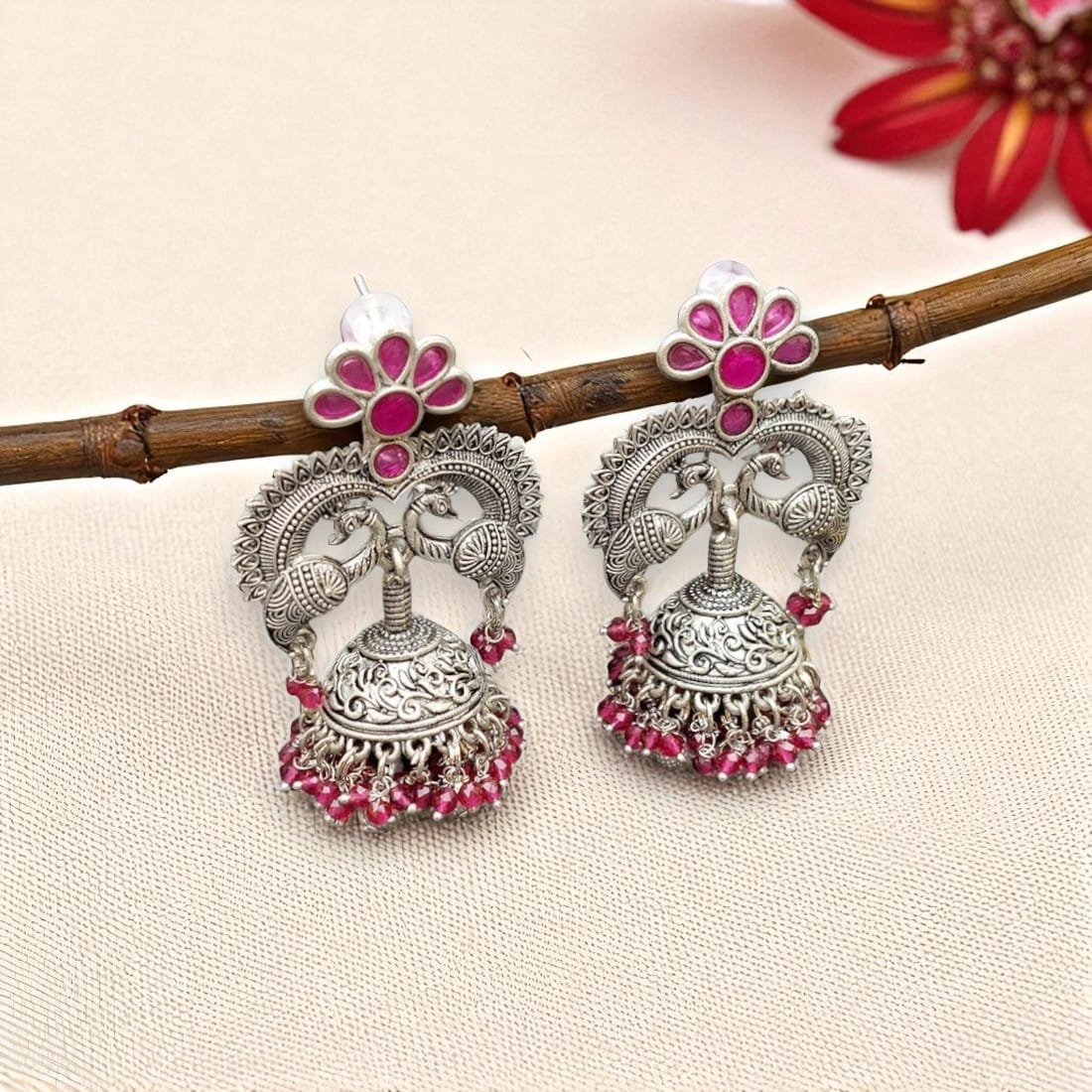 A pair of Kareena Brass Earrings – Pink for a Party.