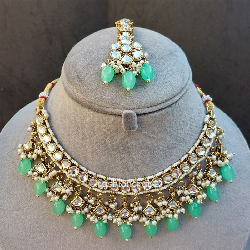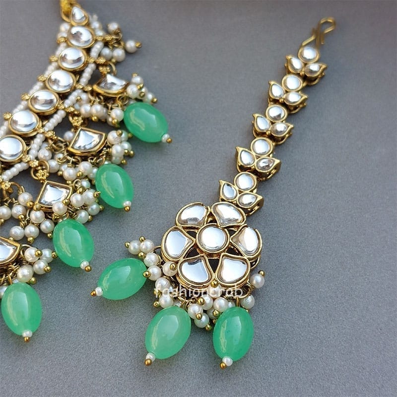 A pair of Traditional Pista Green Katrina Kundan Jewellery Set for a Saree.