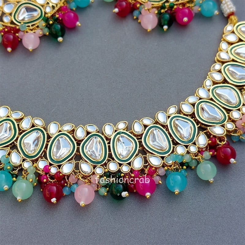 A pair of Traditional Kundan Bridal Multicolor Necklace Set for Wedding.