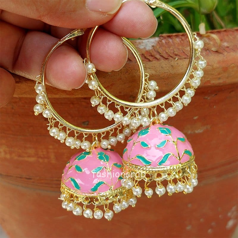 It is the beautiful Light Pink Jhumka Hoop Earring which is very pretty and best of quality. It is made up of alloy metal and has a pearl drop on it. Wear this earring set with matching saree, suit or any Indian attire to get a designer and beautiful look. This lotus earring is available at a pocket-friendly price at Fashioncrab. This meenakari jhumka can be used in daily wear or office wear.