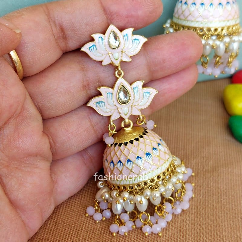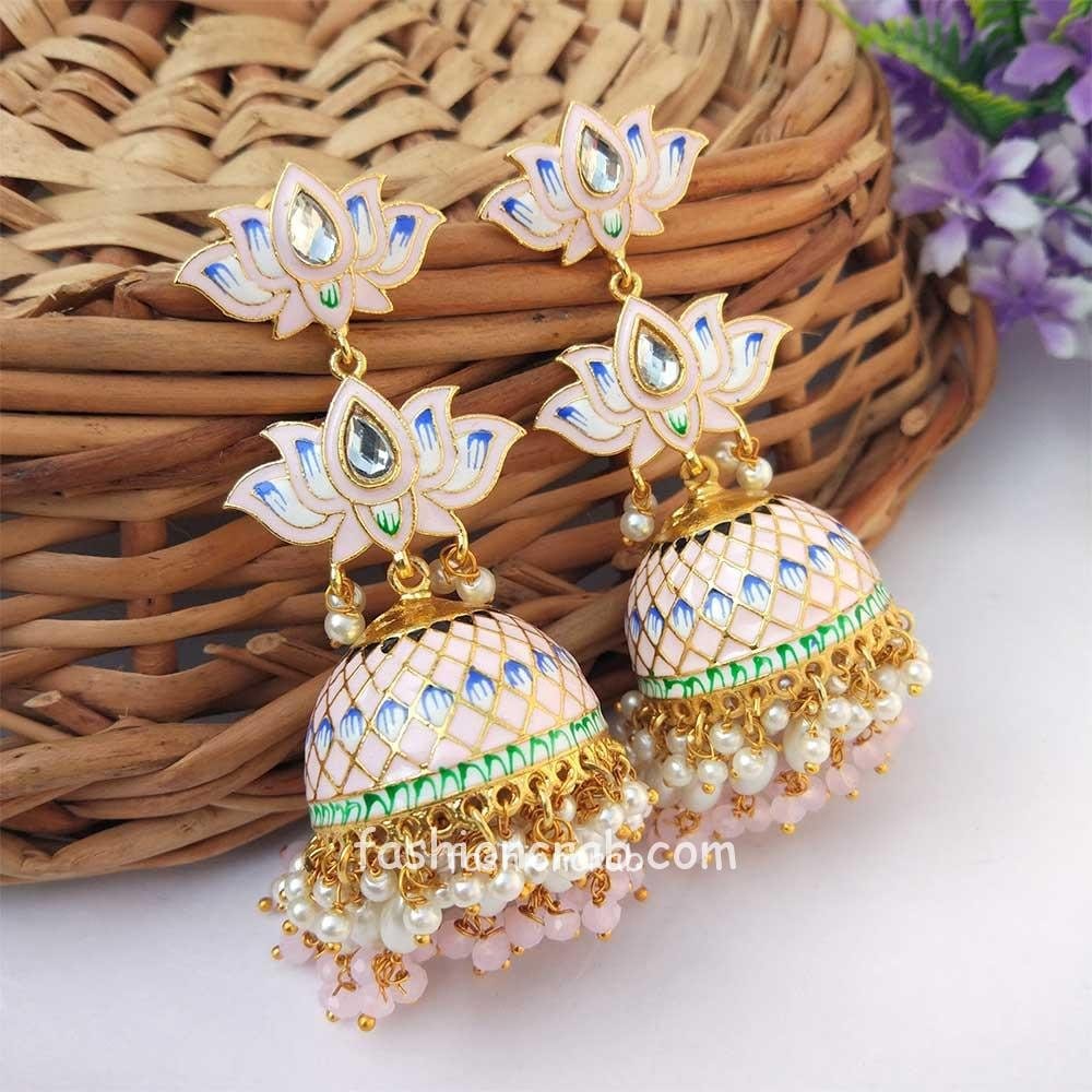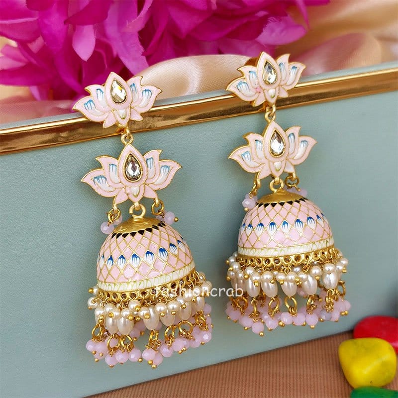 A pair of Gold Tone Light Pink Meenakari Lotus Jhumka Earring for Wedding with meena design.