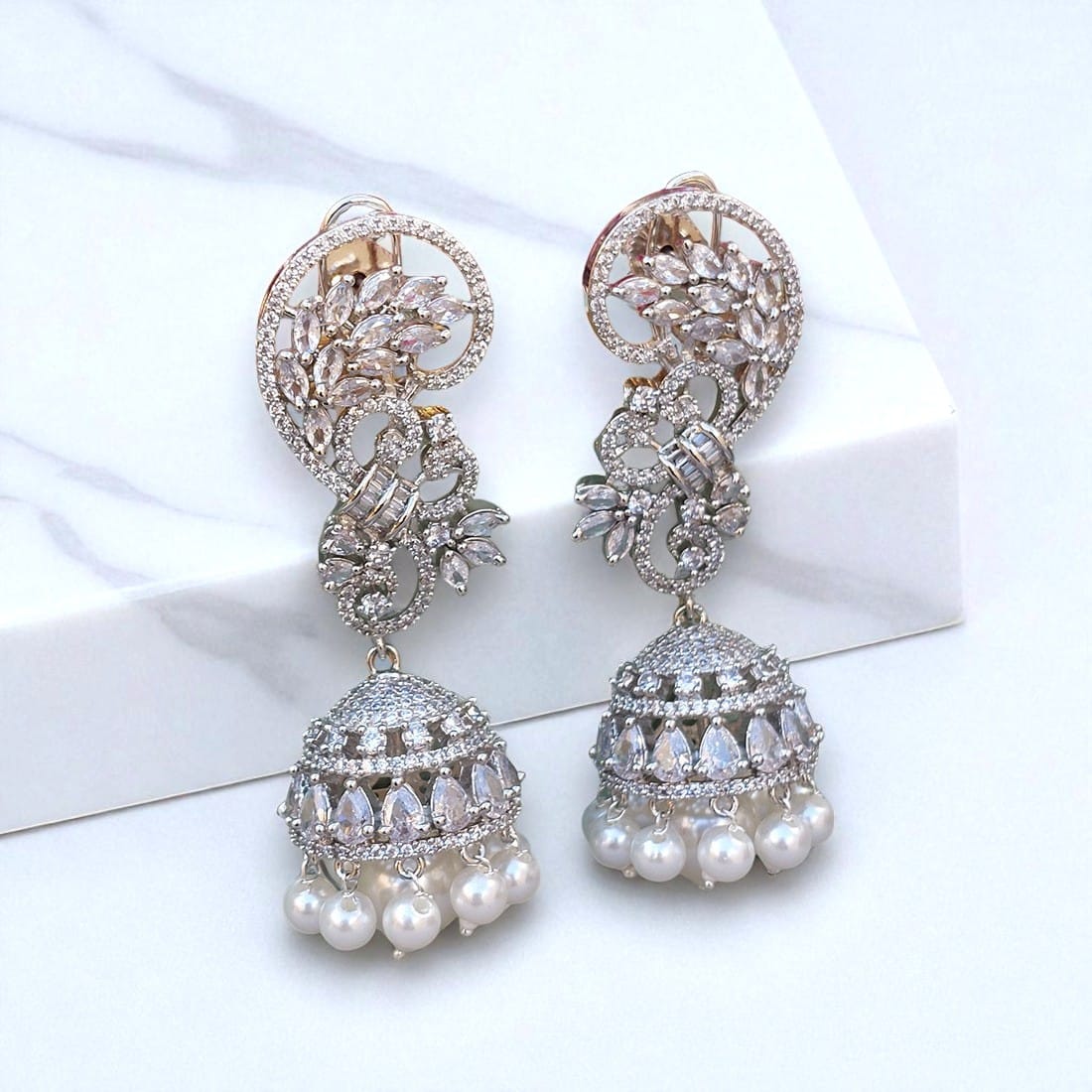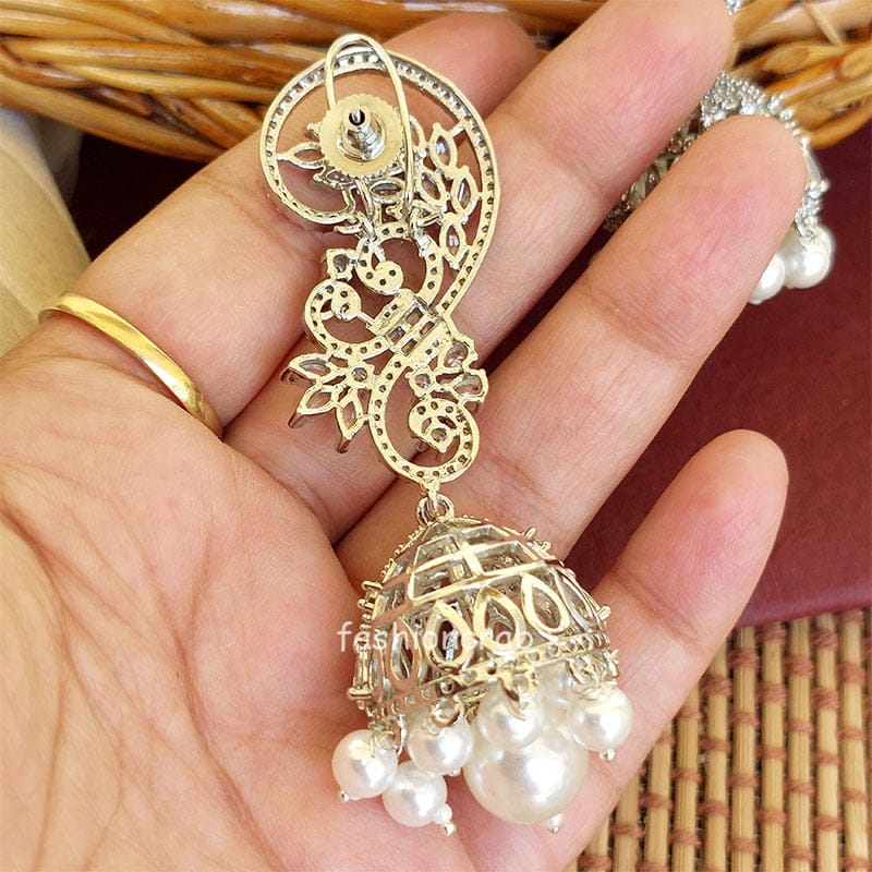 A pair of Rodium Tone Cubic Zirconia Pearl Jhumka Earrings – White Rodium stonework.