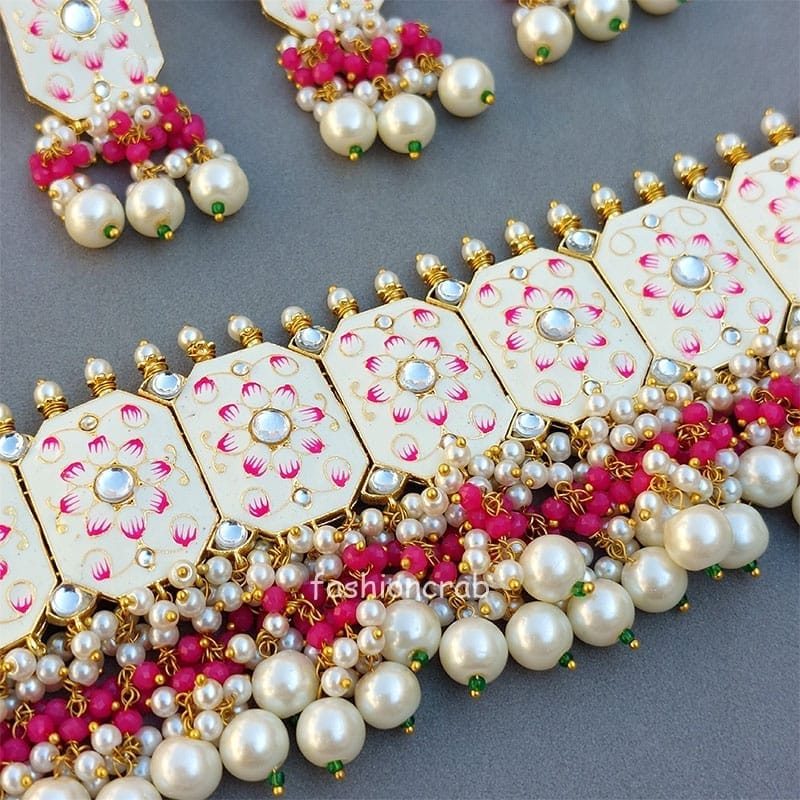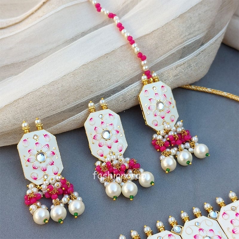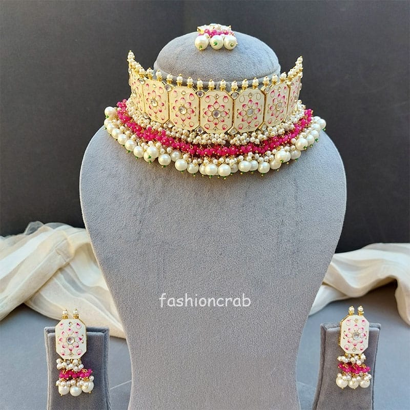 This Beautiful Meenakari White Colour Wedding Choker Necklace for Bride is very much in high trend gives you a real ethnic as well as royal look. Gold-toned Kundan Pearl Earrings have a floral base with stone-studded detail. This choker necklace set is designed for all age groups from college going girl to housewife. This is a piece of handcrafted kundan jewellery set with good quality Kundan and Pearl drops. For more, check out our latest fashion and kundan meena earrings and necklace set.