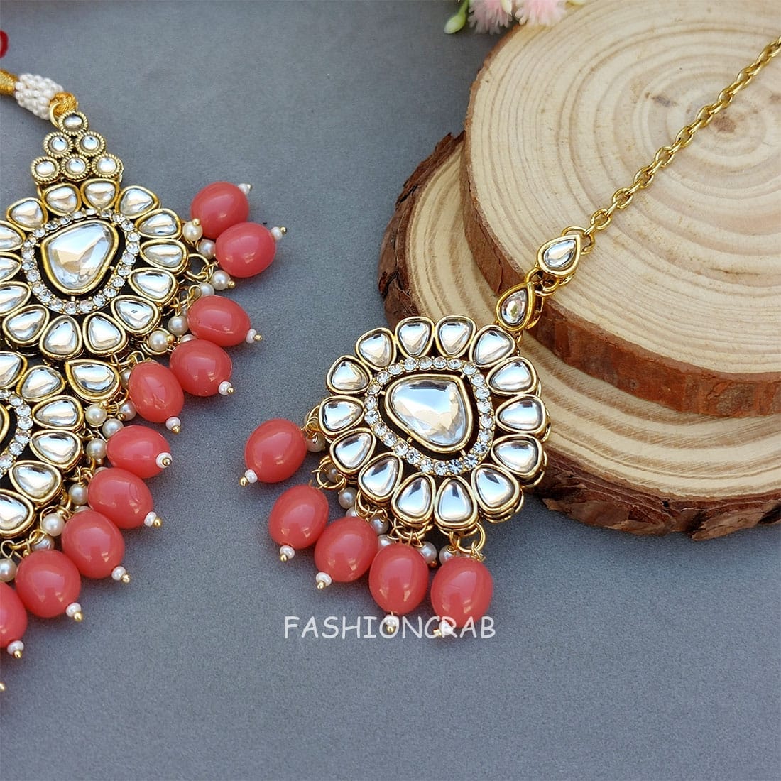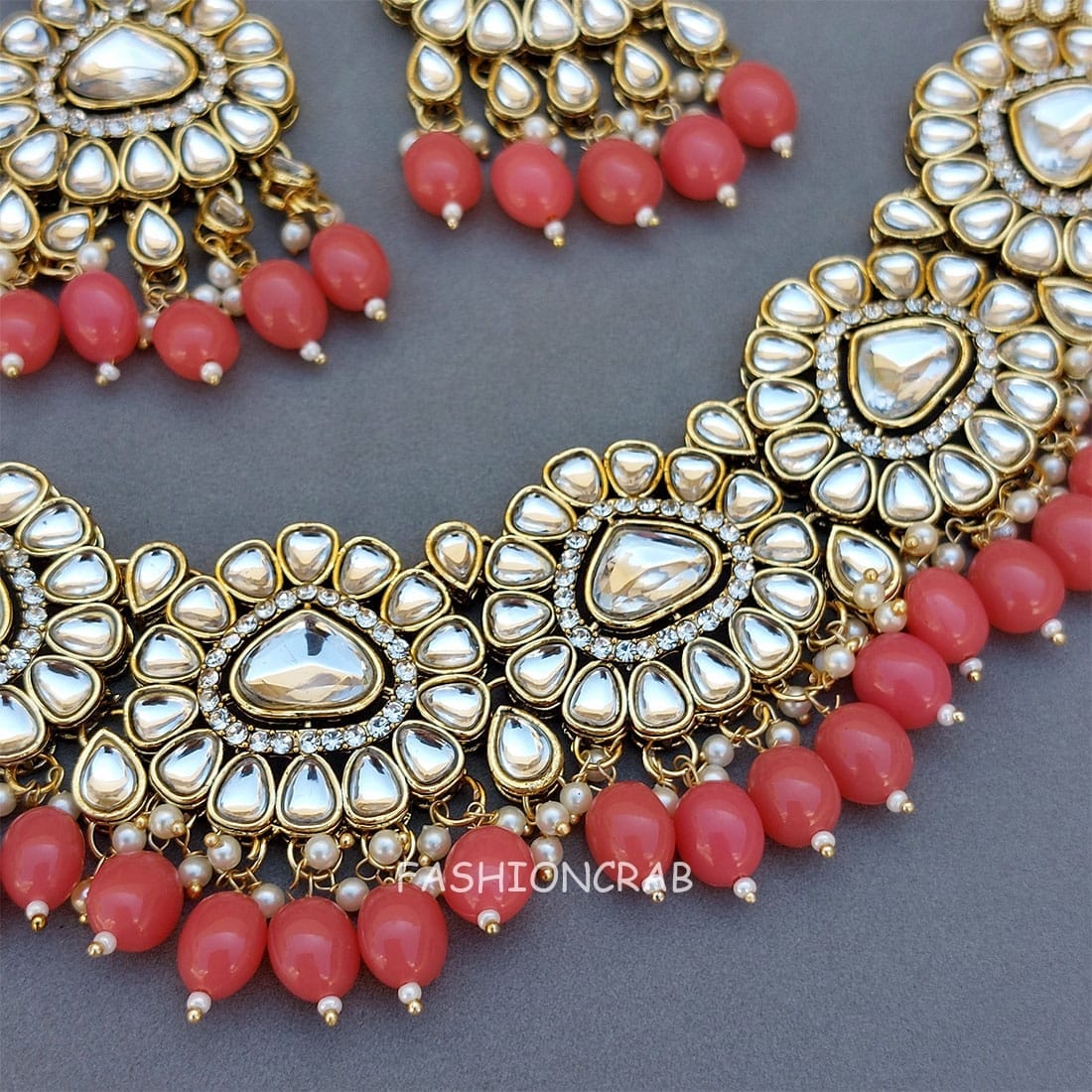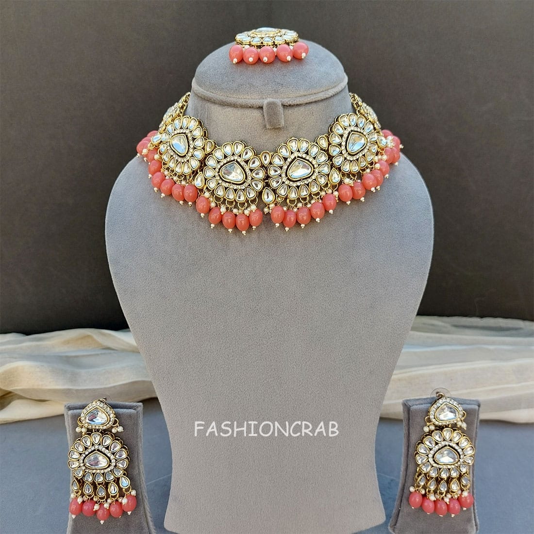 A pair of Traditional Monika Pearl Necklace and Earring Set – Peach for a Saree.