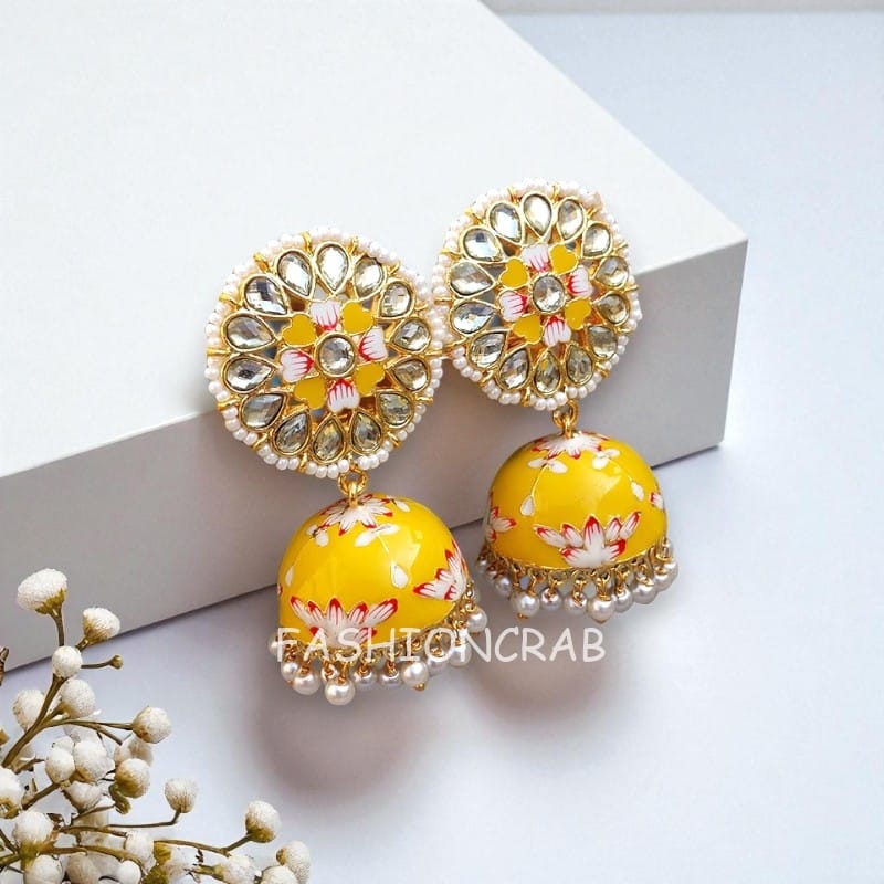 A pair of golden-toned Traditional Hand Painted Meenakari Yellow Jhumka Earring for Women has Kundan stones and white pearls.