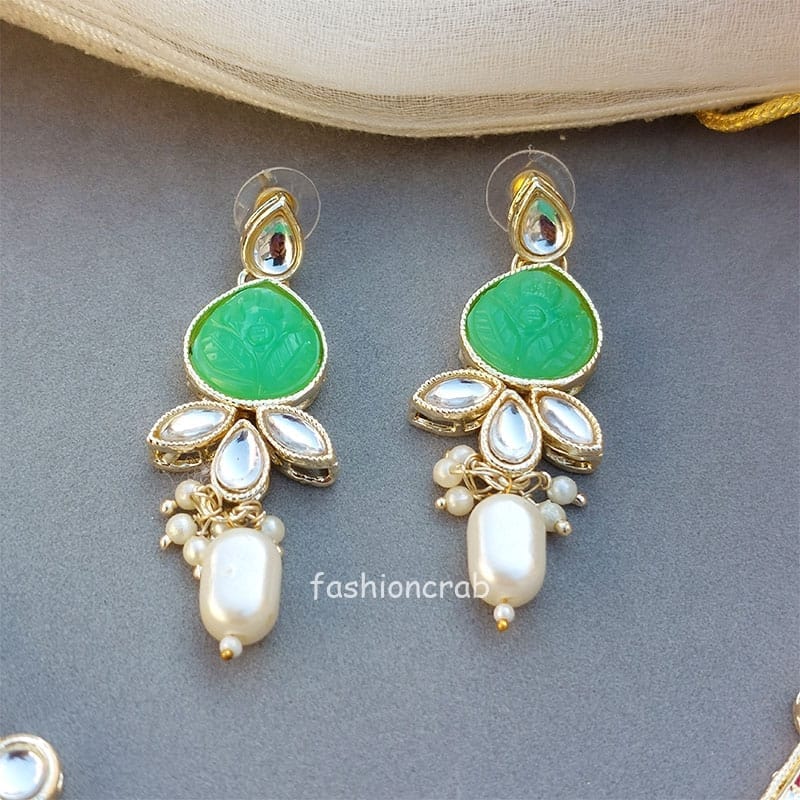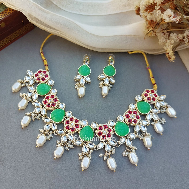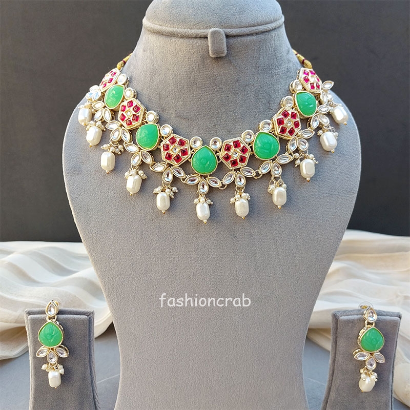 A pair of Traditional Necklace Set for Women – Green Pink for a Saree.