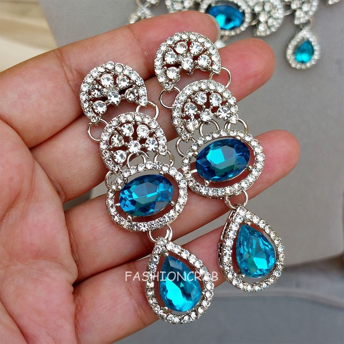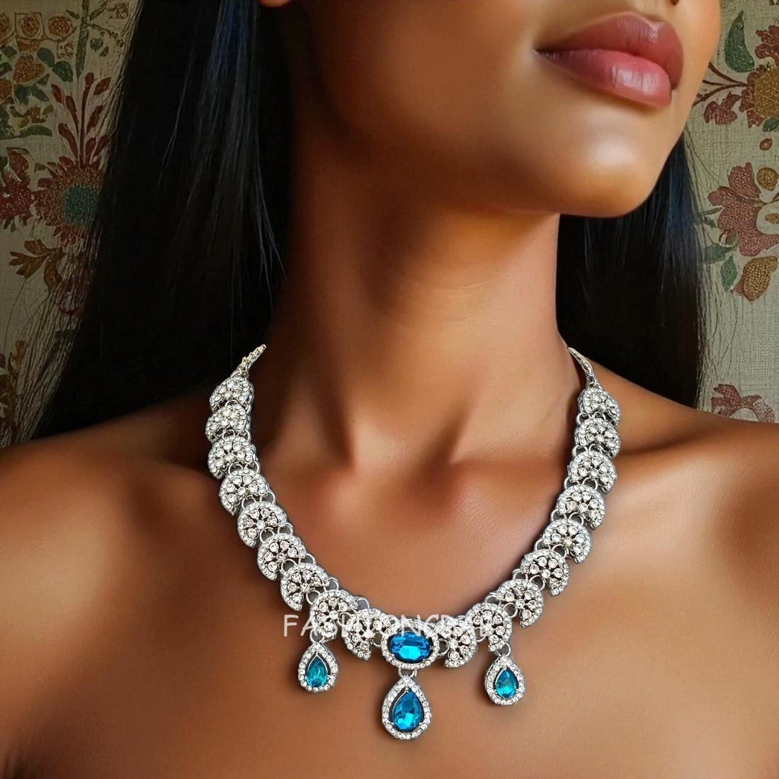 A pair of Silver Tone Nimisha American Diamond Necklace Set – Blue.