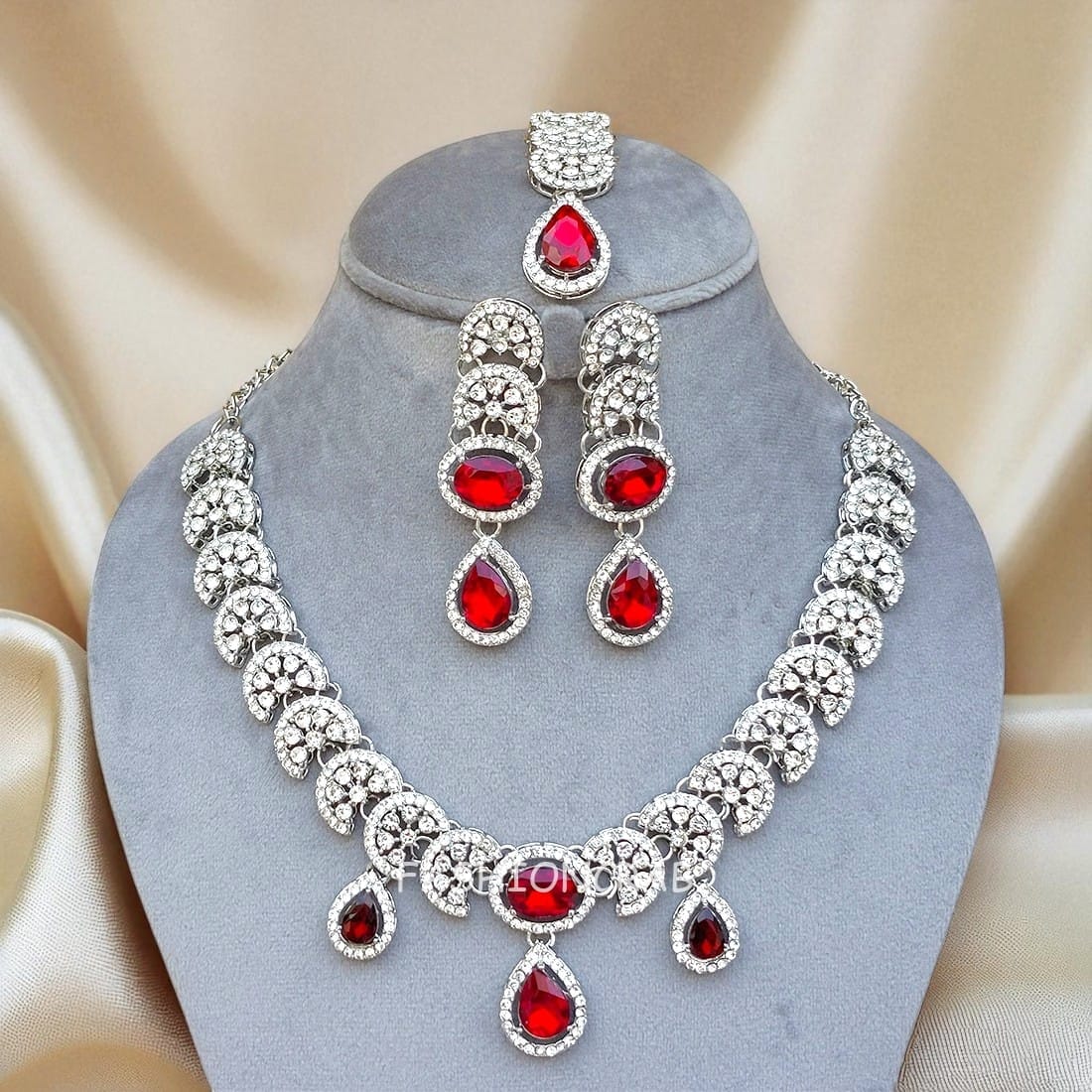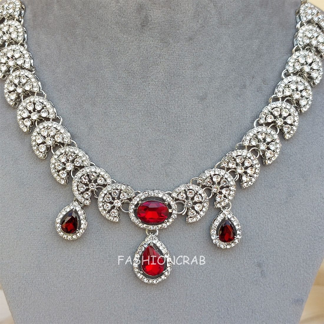 A pair of Silver Tone Nimisha American Diamond Necklace Set – Red.