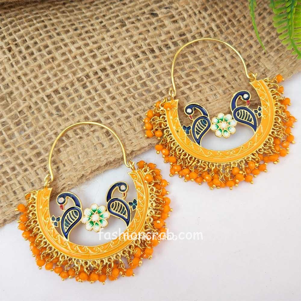 A pair of golden-toned Designer Orange Pearl Hoop Earrings for Lehenga has peacock design with flower in the center.
