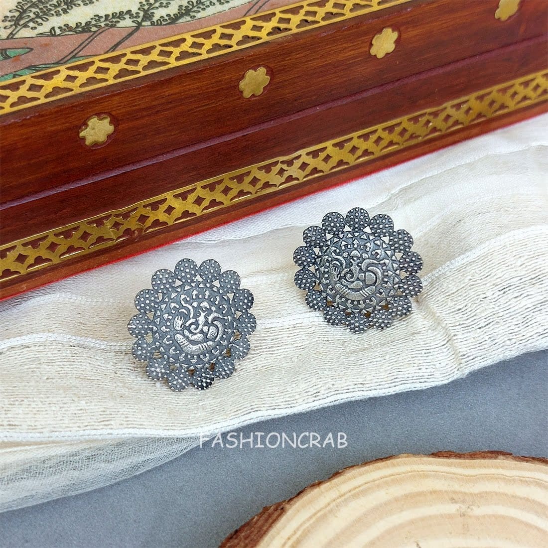 It is the beautiful Antique Ganpati Oxidised Stud earrings for Women. These beautiful earrings are very light in weight and best of quality. It is made up of oxidized metal. Wear this silver ear studs with matching Kurti, Palazzo and western attire to get a simple and beautiful look. These stud earrings are available at a pocket-friendly price at Fashioncrab.