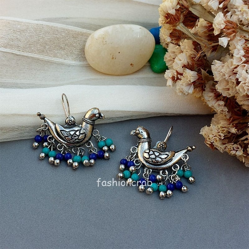 A pair of Oxidized Earrings – Blue Bird with pearl hanging for office.
