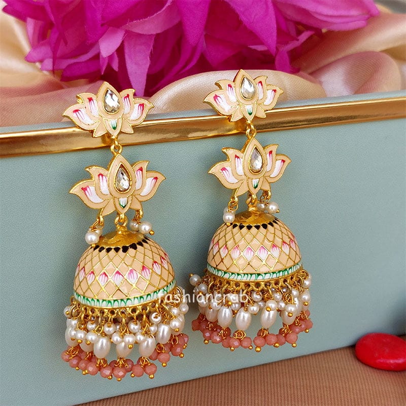 A pair of Gold Tone Peach Meenakari Lotus Jhumka Earring for Wedding with meena design.