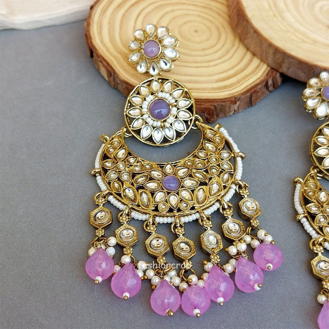 A pair of Golden-toned Priyanka Chandbali Earrings – Lavender with pearl hanging.